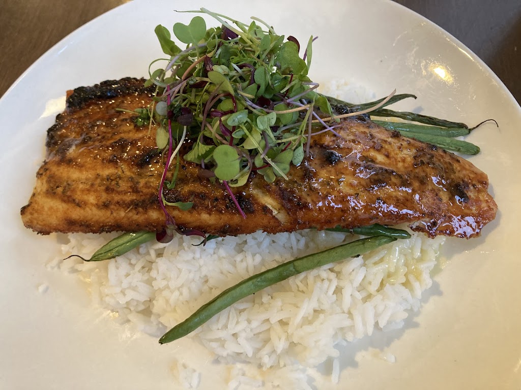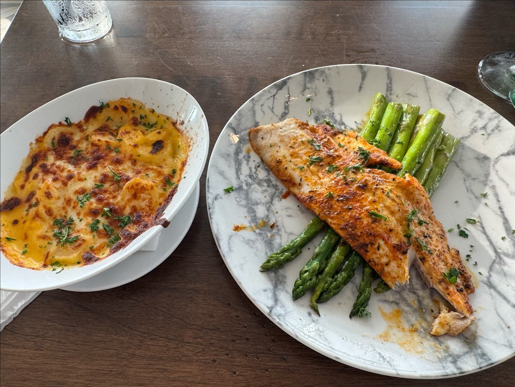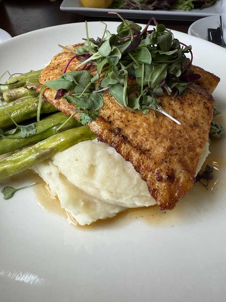 Lunch here. Maddy gave great service! We would definitely come back. Exceeded expectations. Easy and plentiful parking. Blackened trout, skinny fries, asparagus, mashed potatoes - all yum.
