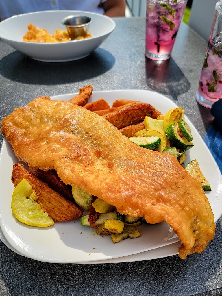 We went for the Friday Fish fry and it was very good. Whitefish can be tricky to get right, and I think they did a good job. The batter was perfectly seasoned and crispy, and the tartar sauce was bright and creamy to match. I got the potato wedges as one of the sides, and they were excellent, plus you get a lot of them. We started the meal with their cheese curds, and they were very good. The batter was similar to tempura batter, which makes it light and crispy. We didn't really care for the tomato jam they were served with, so we added a side of their ranch. It is a lighter version of ranch, which cuts the richness of a fried cheese curd very well, and we really enjoyed that. We each had a blueberry spritzer to drink, and I really enjoyed it. It's made with soda water, so it isn't too sweet, but it does have a sugar rim, which adds a controllable amount of sweetness. Overall, it was a good meal and couldn't beat the outdoor seating overlooking Lake Superior.