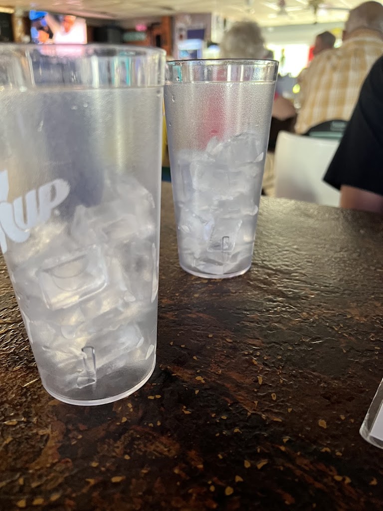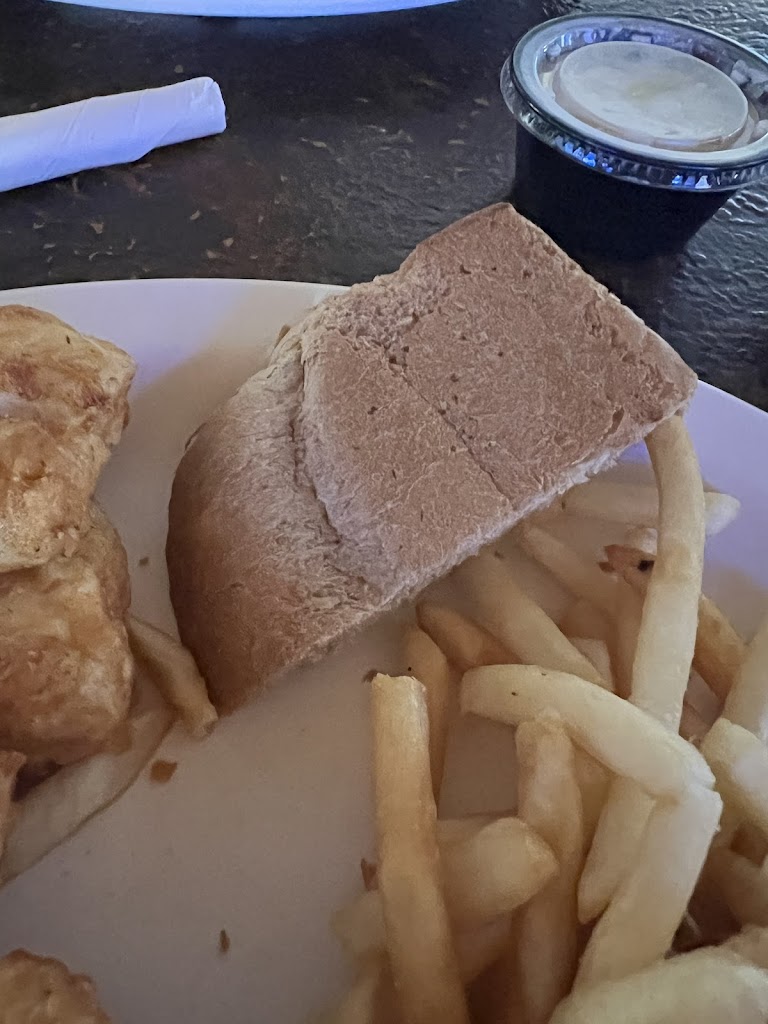 The food usually is good but consistency is an issue. Friday we stopped in for fish dinner. We like to have a glass of water with our meal but sometimes they charge, sometimes they don’t. This time I asked the waitress why that was. She said it was because in summer they have an issue with ice machine. Then why did she give us a glass of ice with the bottled water!? And we have come in the summer and not charged. Also, the butt of a bread loaf should not be used as a slice of bread.