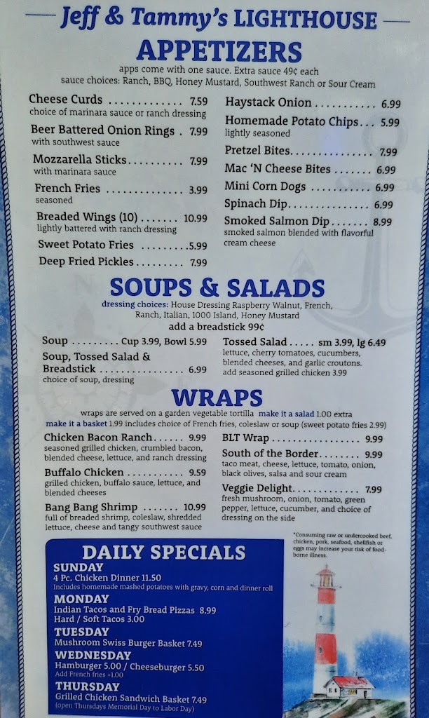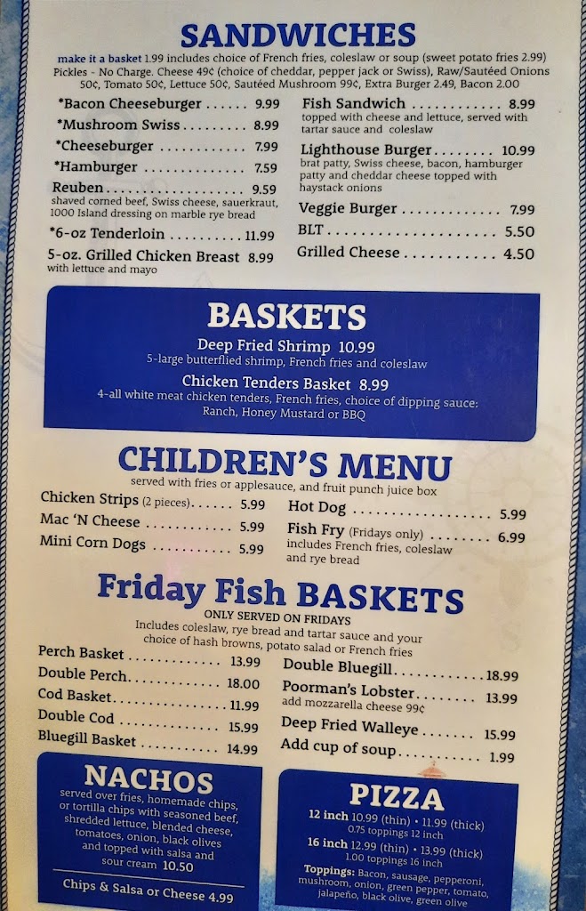We got Indian tacos here and they were so good. They were huge! And a good price! The cheese curds were delicious. We went on a warmer day and sat outside by the water. The waitresses were very attentive and hard working. The lighthouse always has had good food when I have gone.