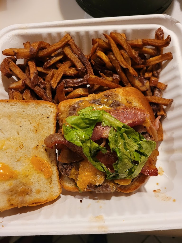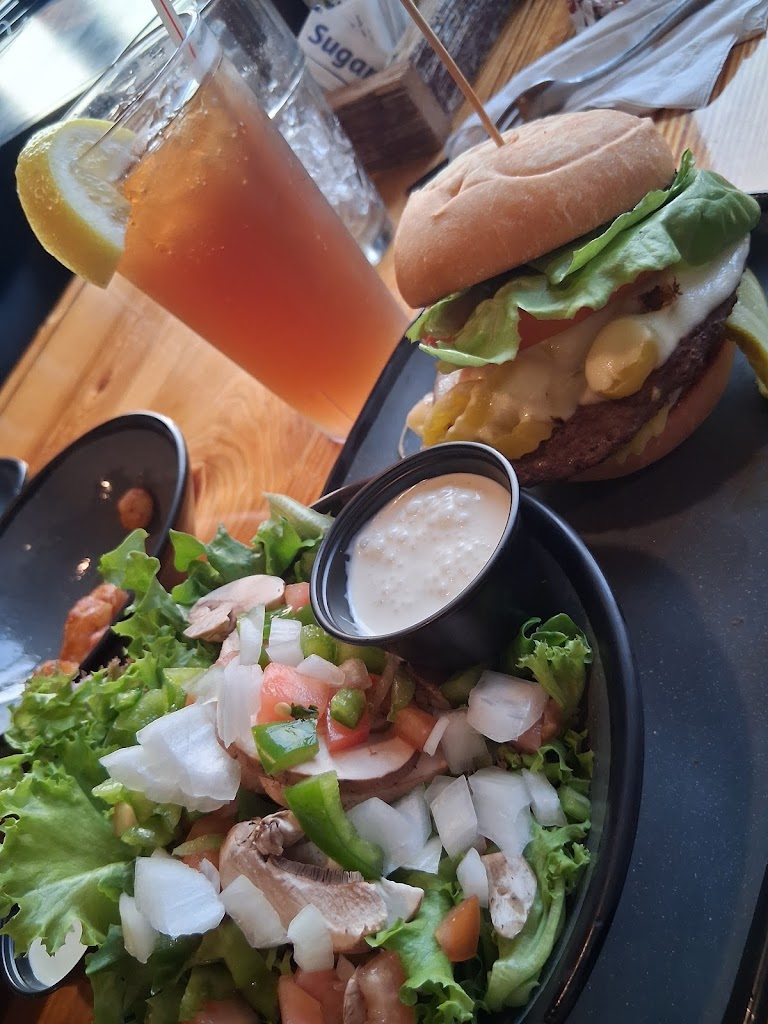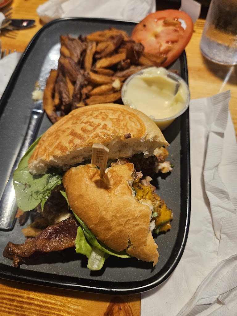 Wasn't to impressed for the first time eating here. First the waitress to 3 orders out of the 4 of us there. She just walked away without taking the 4th order. Had to tell her, Can I order my food. Never came back and asked if we wanted refills. Second. The food came out. Definitely not impressed. Burgers were very dry and over cooked for medium rare. No sauce on them had to ask when it was supposed on the Burgers. Had to load up them up with sauce just to make them taste good. One order was missing fixings. It got sent back, instead of making a new on they just slapped the fixings on the burger. It took less than a minute and it was back at the table. The fries must have been cooked in day old oil. Very dark brown and soggie, dont know how they were cook but did Not taste good at all.