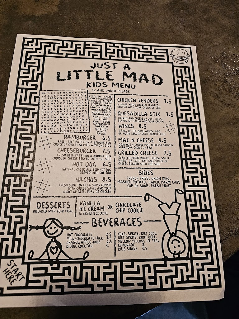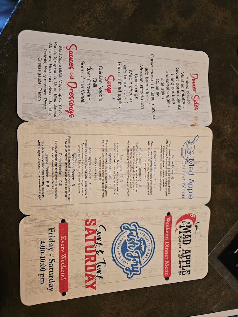 The scratch kitchen at Mad Apple Burger & Billiard Company is a great concept, and some of the food was very good, while other dishes were just okay. They do offer a kids' menu, but we encountered some issues. I'm not sure if it was our waitress or the way the menu is set up, but we were charged for extra items that were supposed to be included, and a few items were missing the first time around. The kids with me usually enjoy their meals at most places, but most of them didn't care for the kids' meals here. On a positive note, the appetizer was very good! Overall, I think the best food was the traditional bar food.
