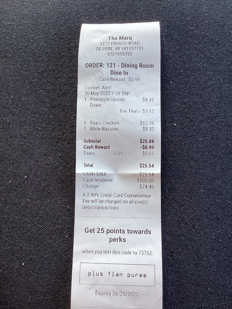 We visited the Marq supper club for the first and last time last Friday with two other. Couples. The food was rather disappointing. The perch on the menu was ocean perch, which was disappointing to the person that ordered it. The ribeye was the worst one we ever had - it was all cordy and chewy. The bar service was good. The poinsettia drink was great and also the old fashions. Our waitress was very good.