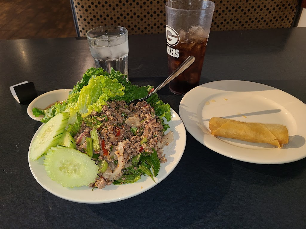 By FAR, the worst dining experience in my life. Ordered the egg rolls, they showed up at room temperature, almost cold and the restaurant only had 1 other customer? Then my beef Laab showed up even colder?? I left after 1 bite because it was cold & disgusting- gave them a 15% tip and went to Arby's which wasn't great but it was warmer. I doubt this was cooked fresh, tasted like cheap buffet that hadn't warmed up yet. The picture is what I left behind after tabbing out & walking. The diet coke was good 👍