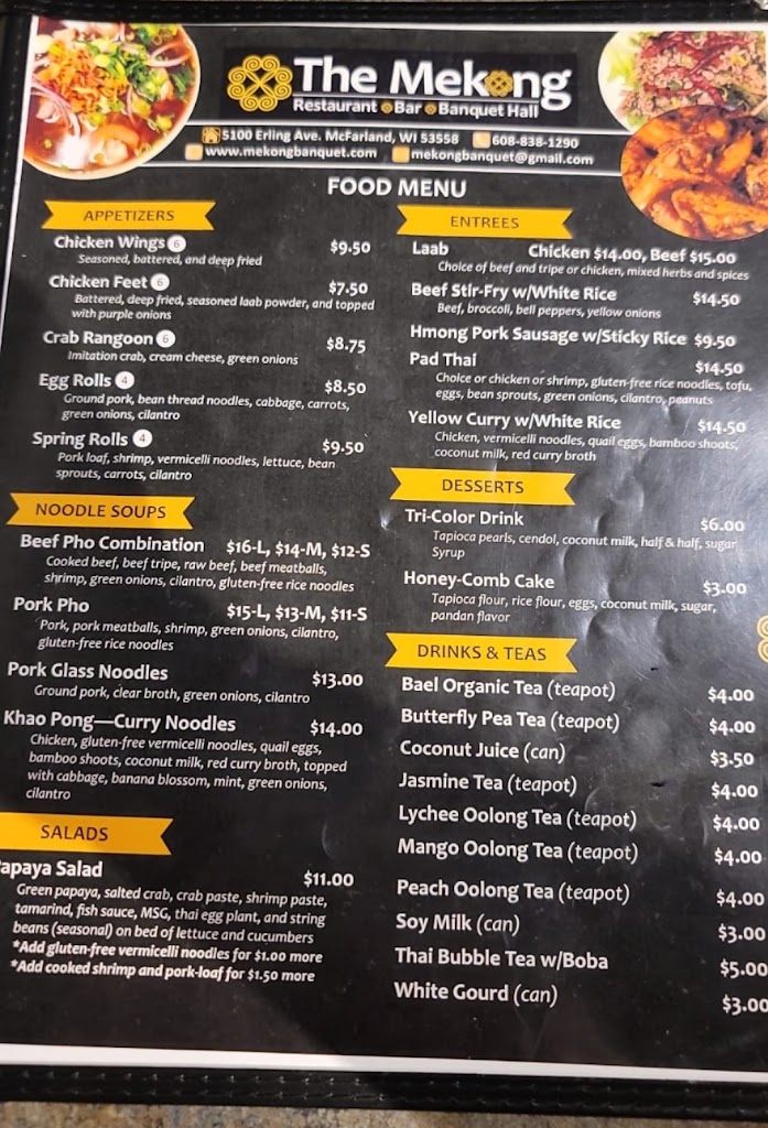 Hmong sausage with sticky rice is really good and only one of two places, I know of, in Madison to get it. The spicy dipping sauce is a must but extremely spicy to beware. Pad Thai is a little tamarind heavy for my taste but my husband likes it. Chicken wings, crab rangoons, and egg rolls are decent. We usually take it to go and food is still very hot. They have a full bar and have had a drink while waiting for food. Staff is very friendly when ordering over the phone and ordering at the bar. They’ve recently changed their hours and are open less. I hope more people give them a chance and they are able to make it in McFarland. This area could use some variety of cuisine.