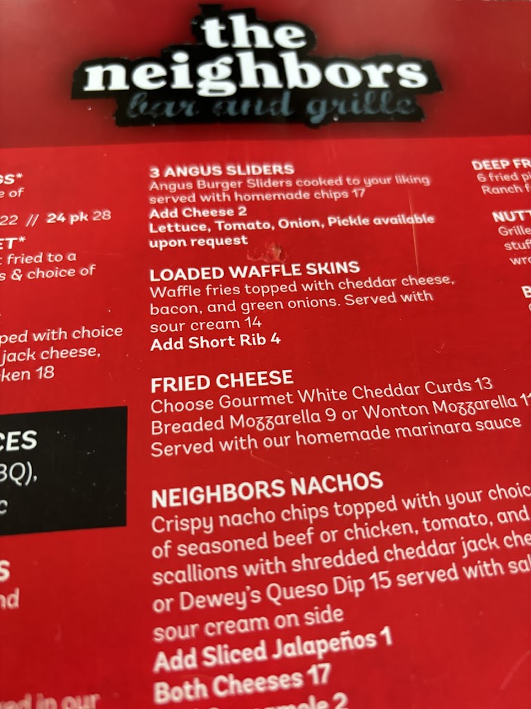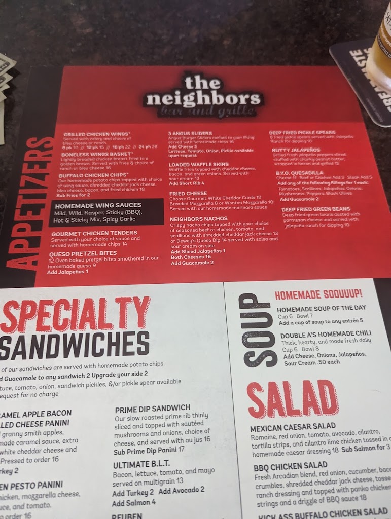 We had a great time at The Neighbors. We brought our pup onto the patio and enjoyed our meal and beer. We had the turkey, avocado, and bacon panini and The Brewer burger, both with tots. Great service. Great food. Super friendly and fun atmosphere. Highly recommend.
