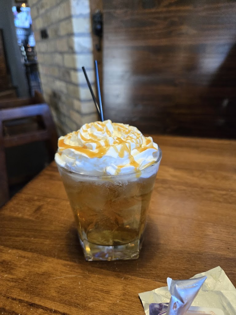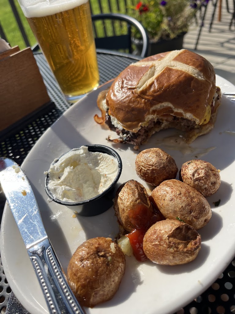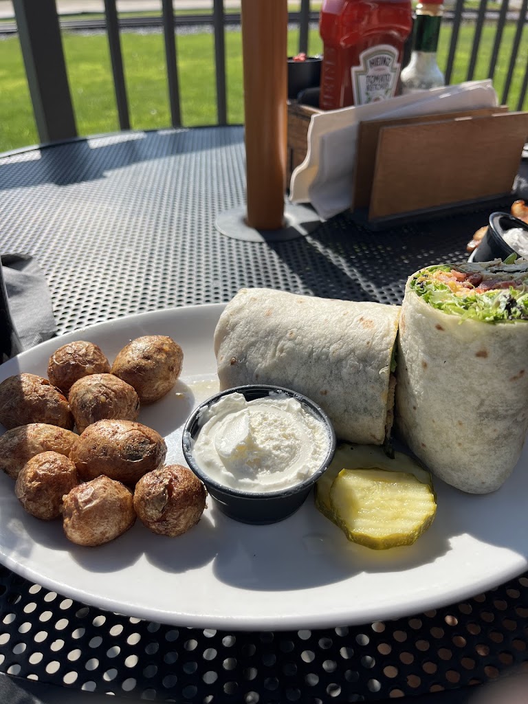 We met friends here late 2021 and I’ve been jonesing since for the chicken wrap my friend ordered. I NEVER order a wrap but hers looked delicious and grilled some and HUGE. So we returned. They have 2 chicken options that both look great. She thought she would have had the chicken bacon so I went with that. Side options included Baby Bakers .. described as small potatoes deep fried. Both were sooo tasty .. Bakers dipped in sour cream. I had a half wrap to reheat in the air fryer another day and it was delicious then as well. DH enjoyed a Pretzel bun burger with bacon goat cheese garlic spread. Also yum. Outside seating and Guinness on tap. Life is good ❤️