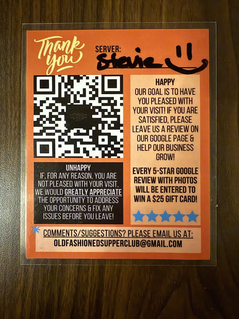 Went out with my wife to have a nice enjoyable evening. The Old Fashioned Supper Club did not disappoint. There is definately a supper club atmosphere. The cocktails were great. The food is the best around. The staff could not be more skilled and cordial. A diner could not ask for a better supper club experience!!!