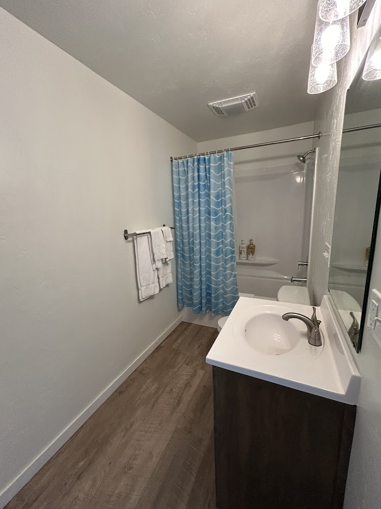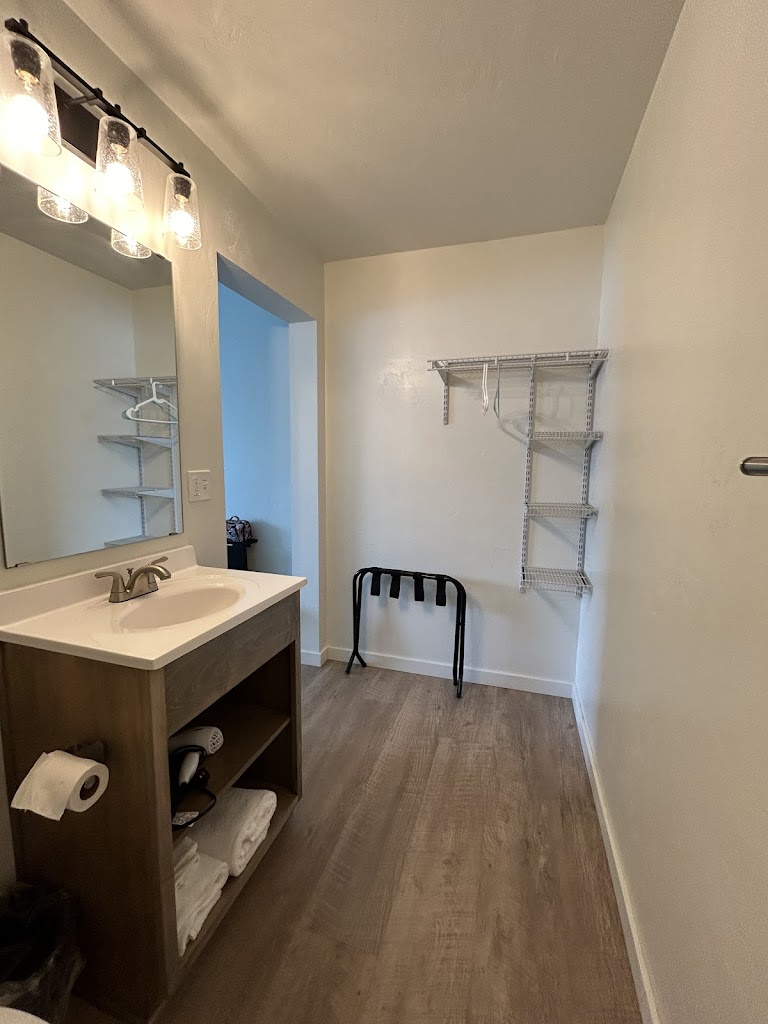 The bathroom was big and had a full size shower/tub combo with full size shampoo and conditioner. We also liked having the shelves and hangers in the bathroom.