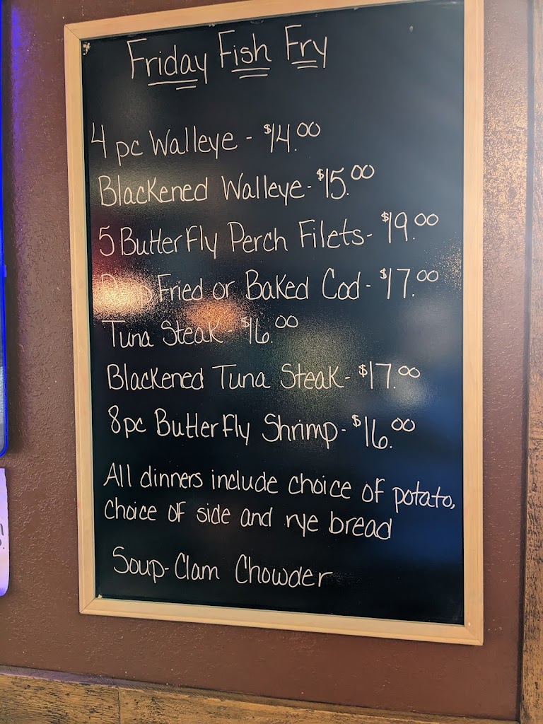 The place was clean. Didn't have to wait long for our fish. The walleye was good.the French fries were good.the cold slaw was creamy and good.the food was very good.
