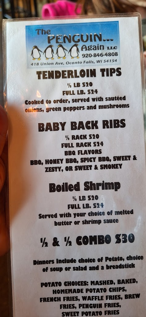 The Penguin Again is Oconto Falls’ go-to destination for delicious comfort food and a cozy dining experience. Conveniently located in Oconto Falls, WI, we proudly serve guests from Oconto, Menominee, Marinette counties, and beyond. Our diverse menu features crowd favorites like hand-tossed pizza, crispy chicken wings, juicy burgers, chicken sandwiches, fresh wraps, and garden-fresh salads—plus daily specials that keep locals coming back. Whether you're planning a casual lunch, a family dinner, or a night out with friends, The Penguin Again offers warm hospitality and mouthwatering meals in a relaxed setting.