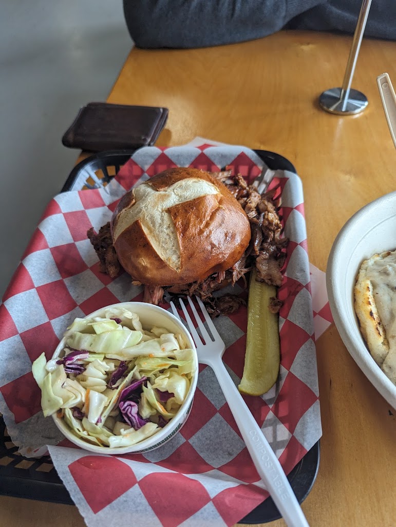 Predictably good food. Had lunch with 3 guys who like to eat. Pretzel roll was perfect for the BBQ pulled pork or brisket sandwich. Fries were both tasty and a nice portion. Solid assortment of beers. Both indoor and outdoor seating. Clean!