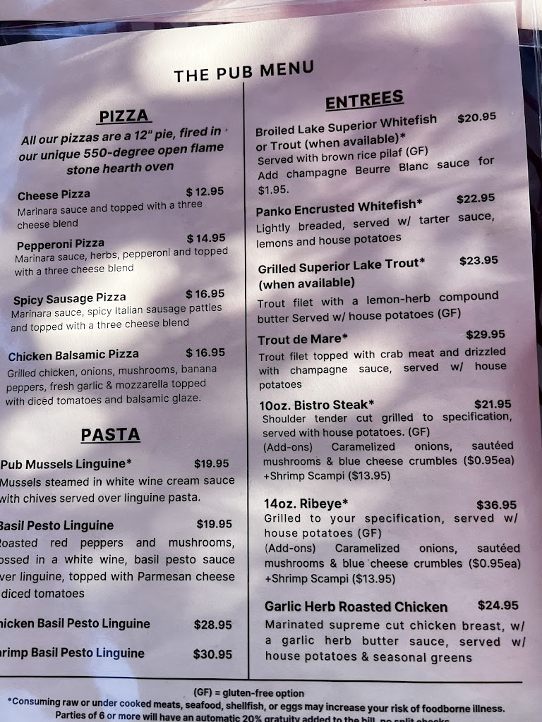 A Must for a beautiful sunset dinner view over Lake Superior, amazing fresh fish entrees and a wait staff that is always happy to make your dinner feel like you have been friends since kindergarten. Great wine selection and full bar service plus they serve pizza and other smaller dishes in the bar or to go. This is also family friendly and a wonderful place for a reception or rehersal dinner. Top Notch and a must if you are on the Island for any amount of time. Cheers!!