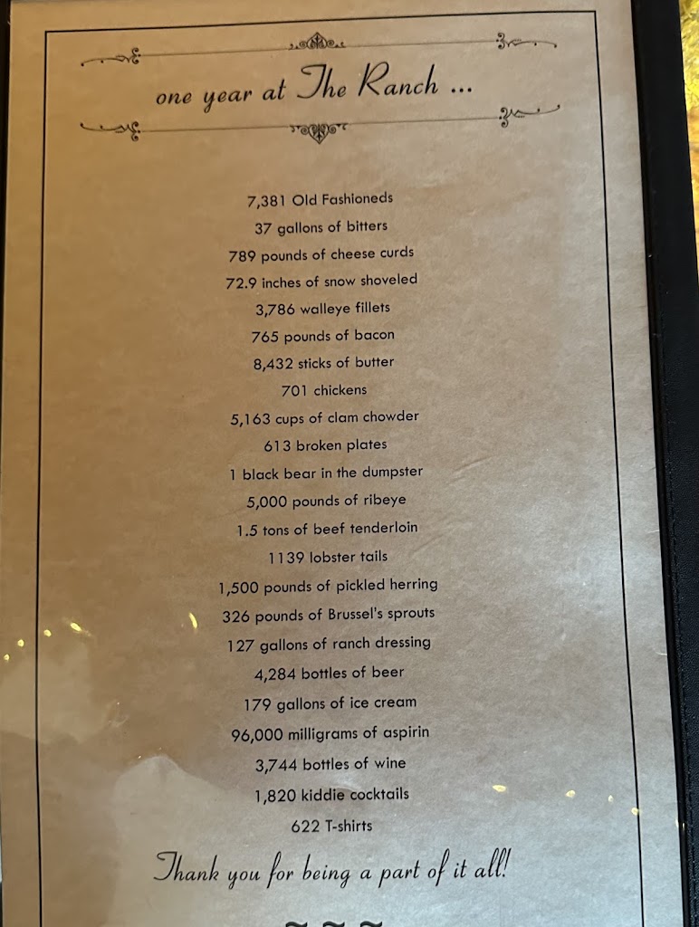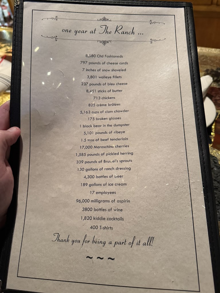 The Ranch still is the place to go after all these years! Shout out to Haley and our server, Amy, and all the other energetic staff. We had walleye and steak and our granddaughters had the generous kids menu. Relish tray was delicious and my Old Fashioned was the best. With all the new staff, it was clear to me that Haley and her chefs have taken the time and effort to train their staff. Thank you, Ranch family!!!