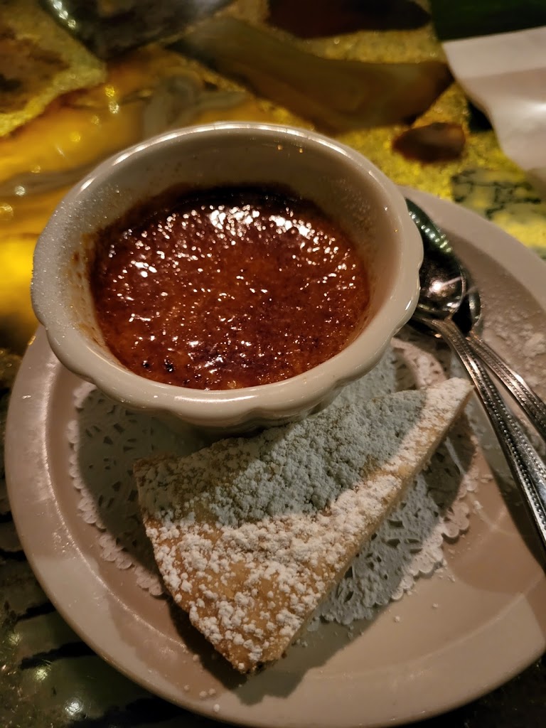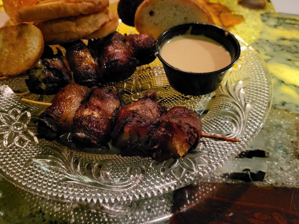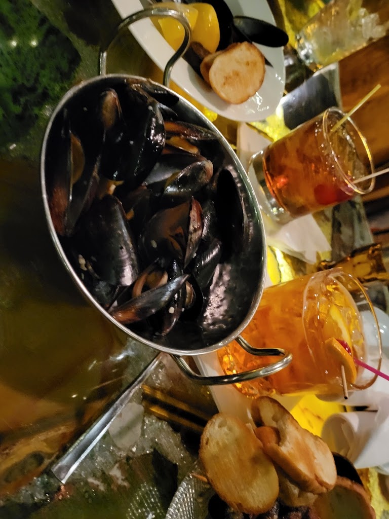 King cut prime rib, bacon wrapped dates, relish tray, steamed mussels, brandy Alexander, & crème brûlée.