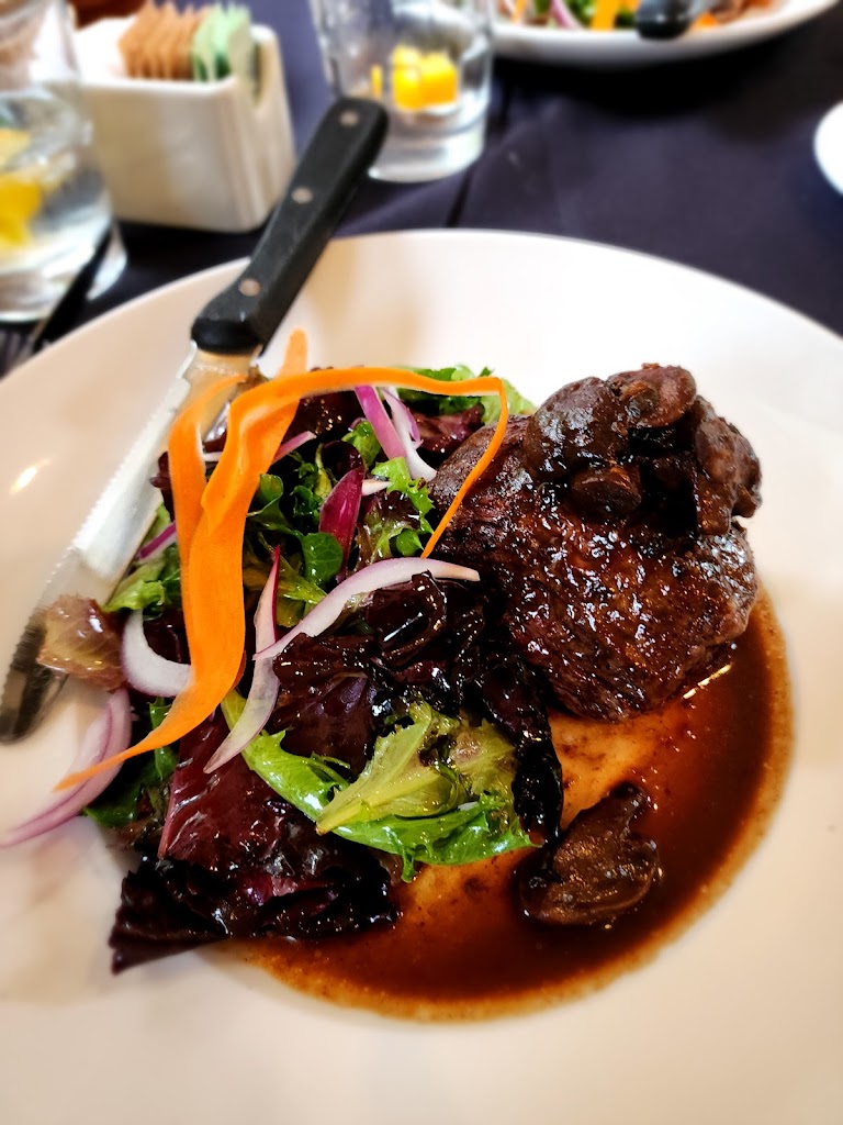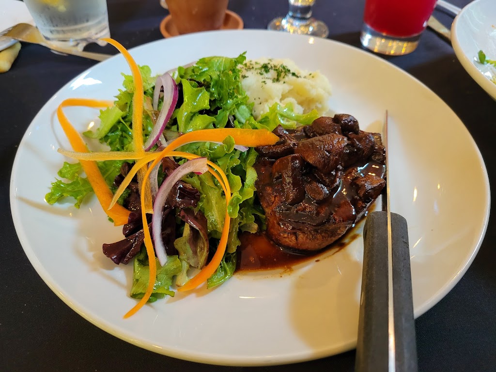 We ordered an asparagus salad to replace the pork orzo. One of the reasons I chose a salad was because I was hoping it would come fast (since nothing needs to be cooked) and we could eat the entrees together. It took an extremely long time to get the salad…we were done with eating the chicken before getting the salad. The salad was fresh, and the asparagus and mushroom components tasted good…but the dressing and salad as a whole had very little flavor. I asked our server for salt and pepper.