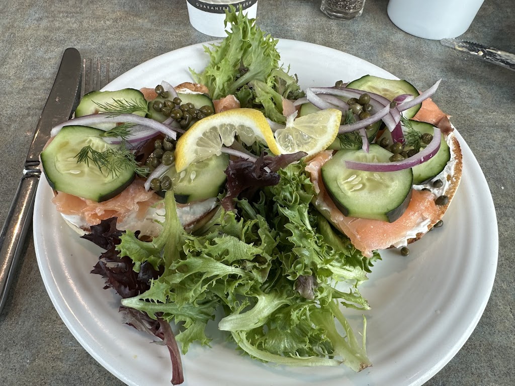 Salmon bagel.. wow. Benedict eggs great! People really friendly. Good not crazy sweet tea!