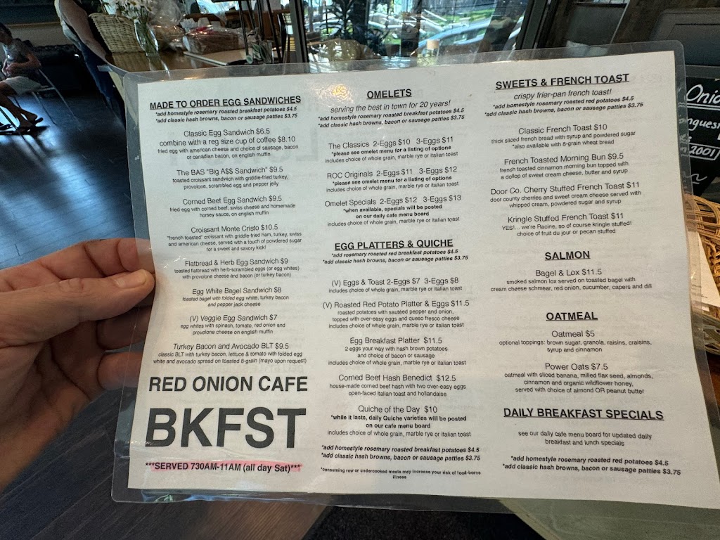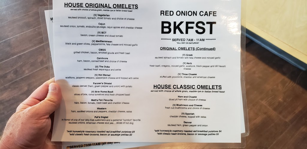 Updated Review - 12/30/22: Last minute, we decided to go out for breakfast. The first place we thought of was the Red Onion Cafe. It is only five minutes from our house…. Super convenient! We sat down and immediately saw our former neighbor and his son walking in. They sat with us. Five minutes later another neighbor and his wife walked in. That is what we like about the Red Onion…. it is GREAT neighborhood restaurant. The food is delicious…. The atmosphere is great…. And the service is fast and friendly. We highly recommend The Red Onion Cafe!