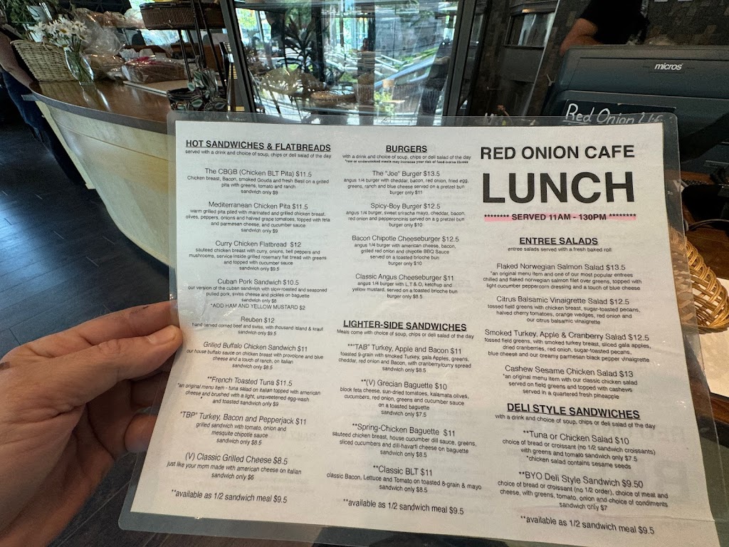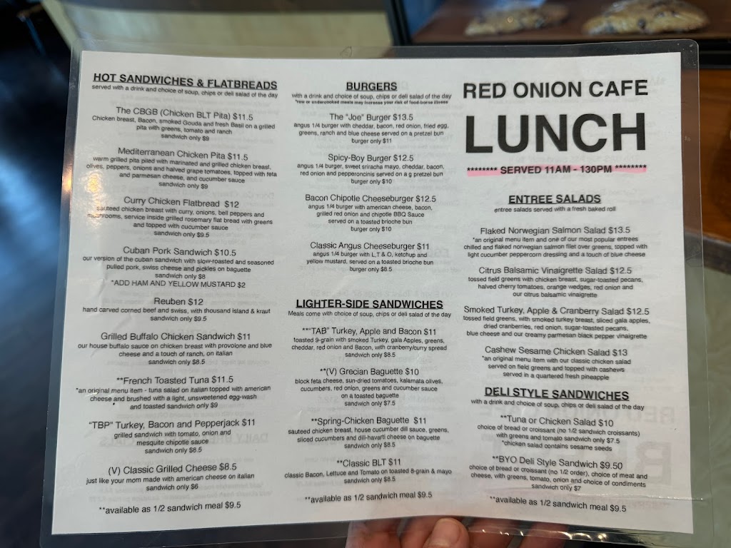 Delicious food. Great specials for a mix up to the normal menu. And you can't beat the pricing. Under $8 for a full sandwich, soup, beget, and drink. 10 out of 10 times I would go to Red Onion over Panera.