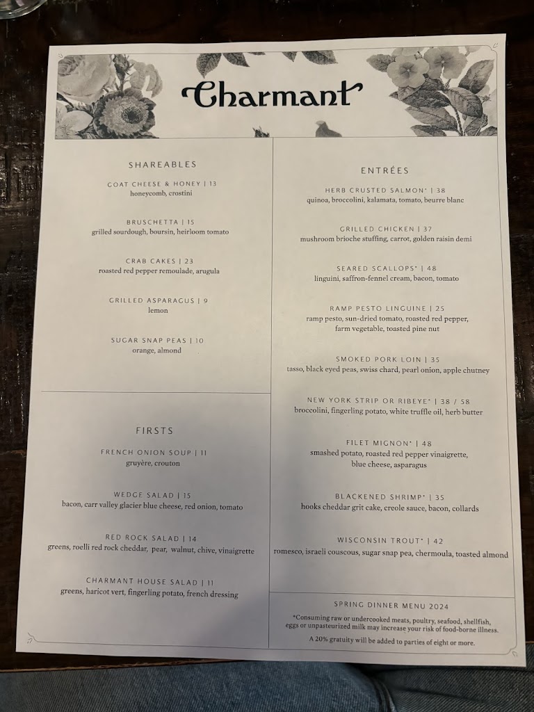 Amazing experience at The Charmant! The house-made ranch is out of this world, and Molly gave us the best serviceβsuper friendly and attentive. Highly recommend!