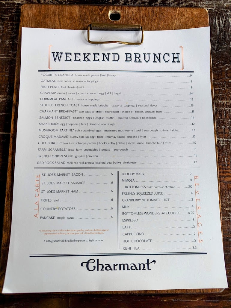 We have visited the Charmant Restaurant for dinner and for brunch, and we always have an amazing experience. The staff is usually friendly and our service is surprisingly fast. The atmosphere is so unique; very classy while also relaxed, with a view of the river. The food, though! Our meals were incredible. We highly recommend the salmon benedict and the farm scramble.