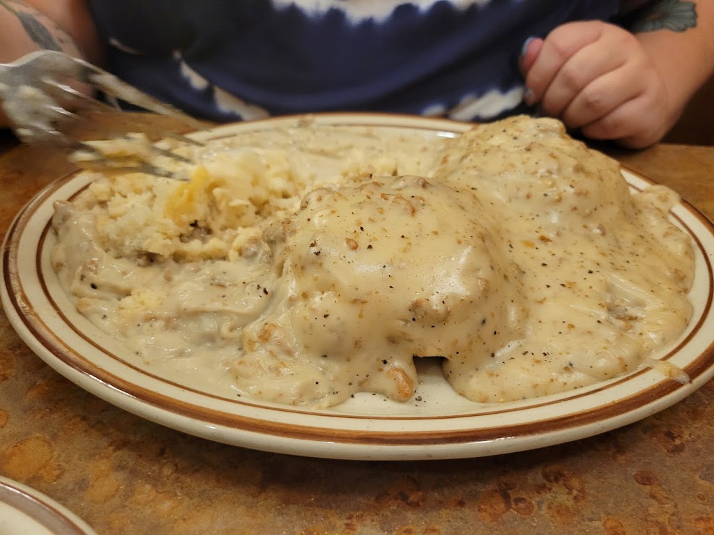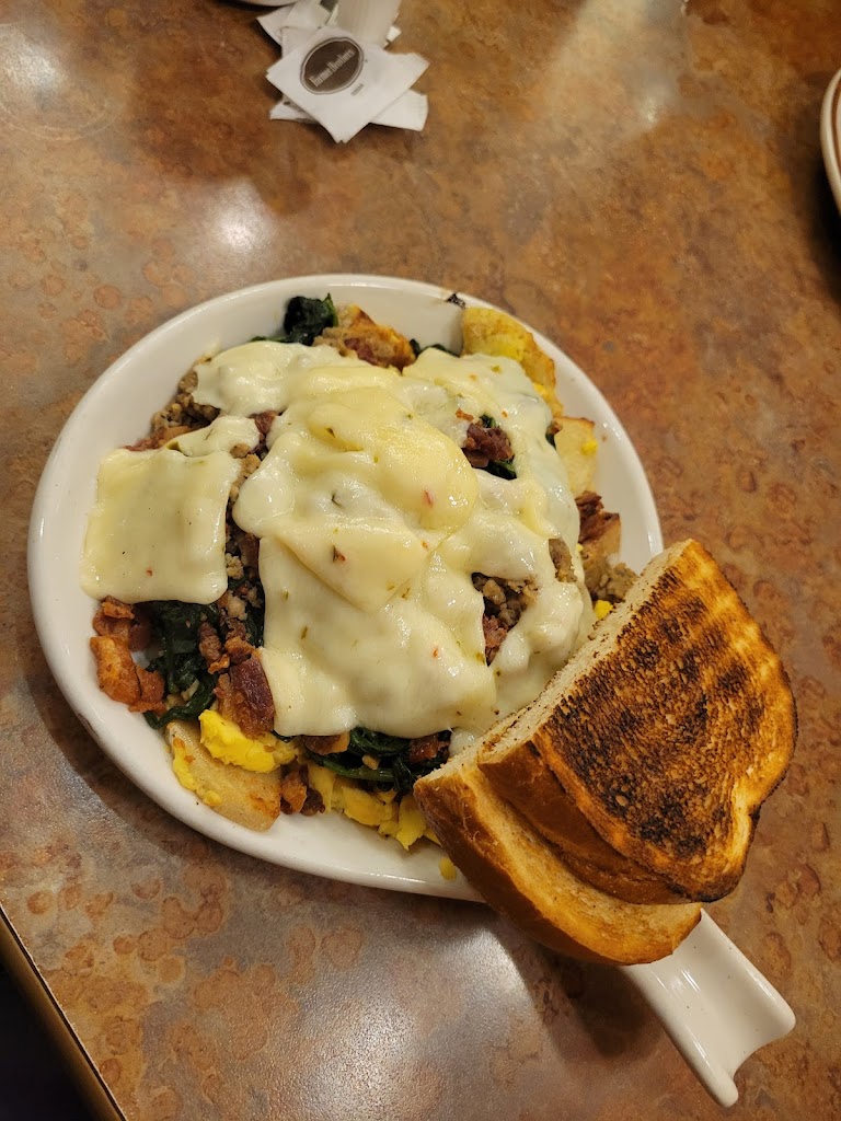 Stopped by here for a quick breakfast and boy am I glad I did! From entering you are greeted by smiling, happy people ready to seat you even without reservation. There were so many choices for breakfast items, but ultimately I decided on the build your own skillet with bacon, italian sausage, spinach, and pepper jack cheese over a bed on potatoe fried dumplings. My girlfriend got the 3 biscuits and gravy. Let me start with saying that we GREATLY underestimated the portion sizes, the skillet was phenomenal with amazing taste with every bite. The biscuits and gravy tasted amazing as well with amazing sausage gravy taste with every bite. As far as service goes, our waitress Shannon was very attentive and very enthusiastic, even with the busy atmosphere. I can't wait to return and try the dinner next time im in town. For everyone else wondering if this is worth a try, It's definitely worth it!