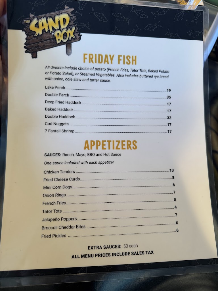 After a suggestion, we went to The Sand Box to try out their fish fry. Everything was great.