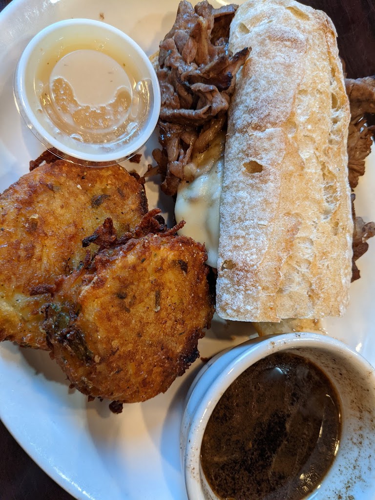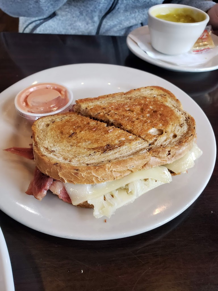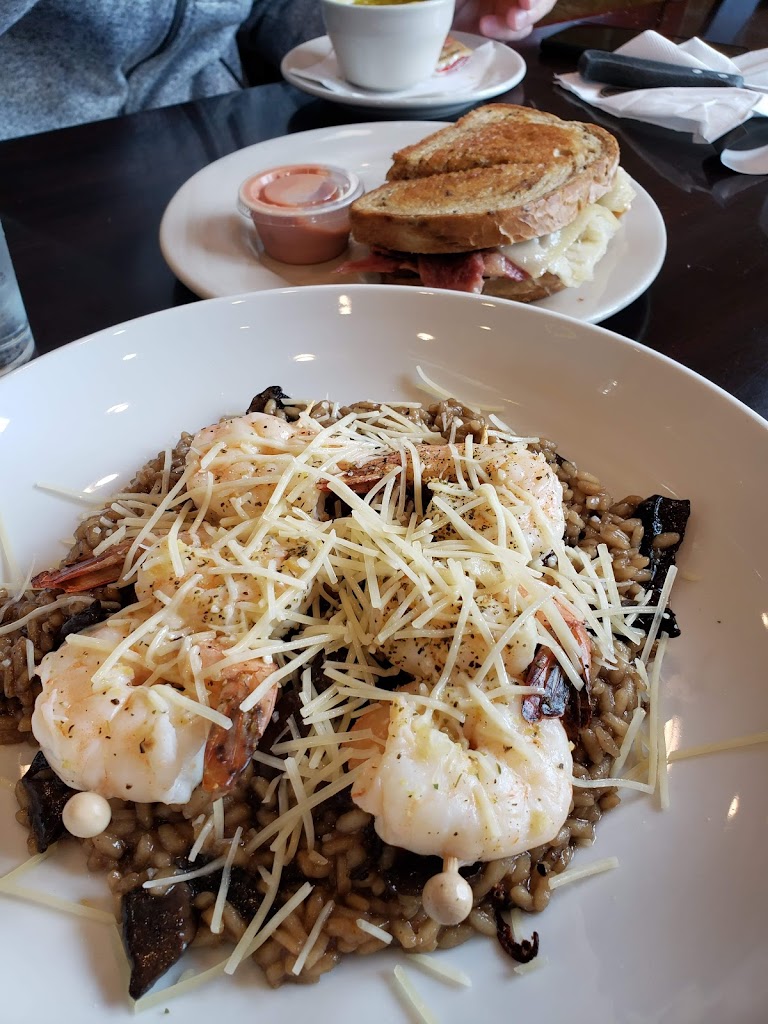 We went to Slinger house for weekday lunch. We ordered the Reuben sandwich with soup of the day, and the shrimp and mushrooms risotto with french onion soup. Both soups were good, we really enjoyed the french onion. The portions were large. The Reuben tasted amazing and the risotto was good - I did enjoy it and got two meals out of it, but I expected it to be lighter and wouldn't get it again. Overall, good service and experience.