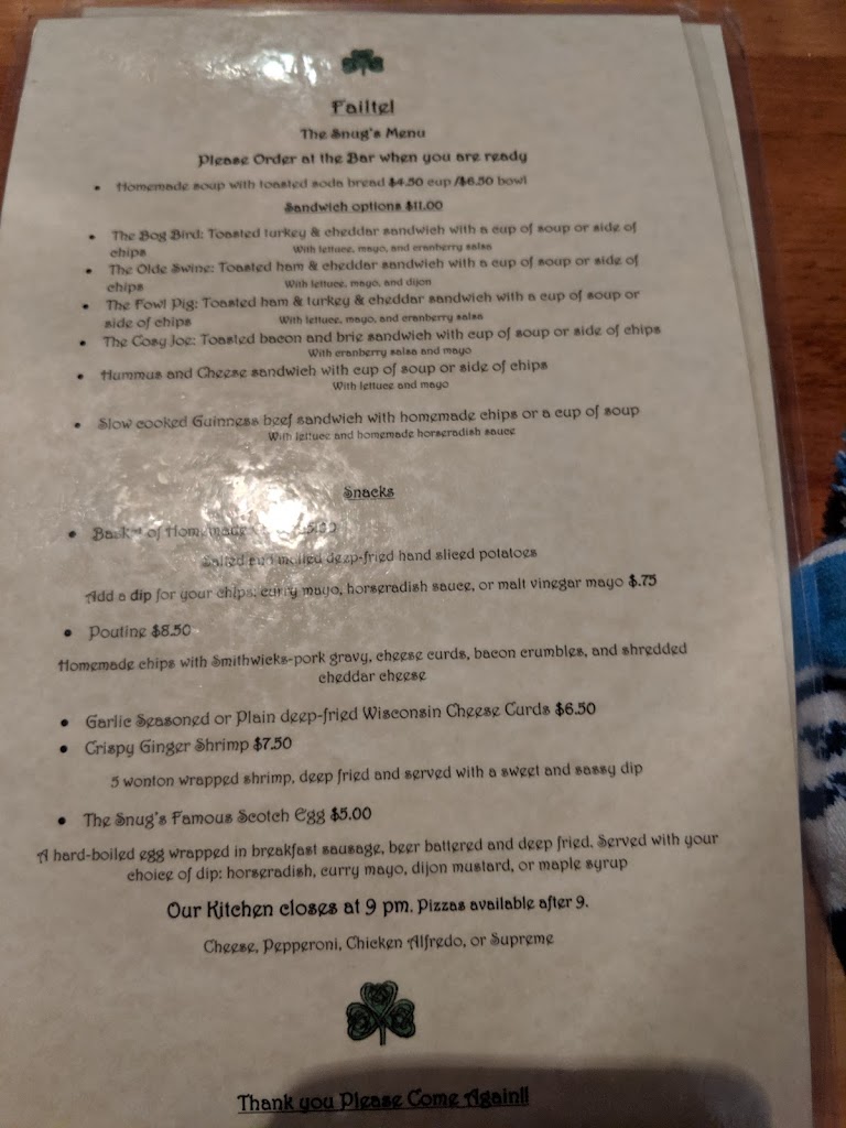 "The Snug" bills itself as an Irish pub, but that's mostly in name only. There menu is limited, but the food (mostly sandwiches, soup, and"chips") is good. The prices are very reasonable. The staff is friendly, and it's a place that I'd come back to.