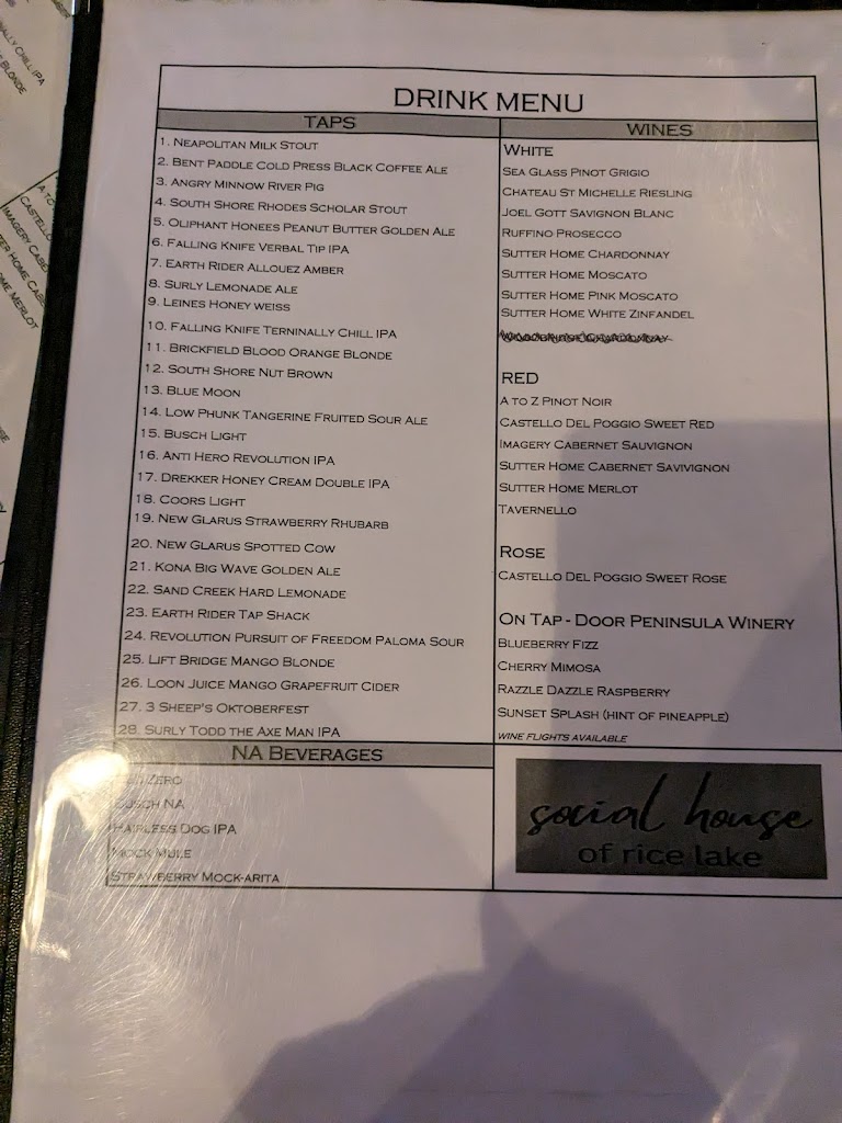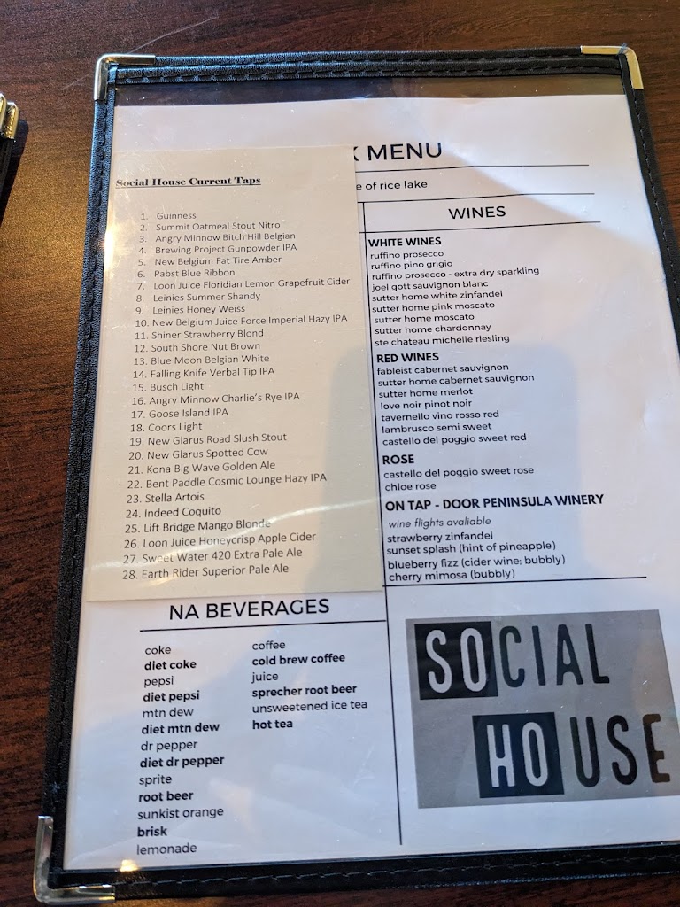 Food was terrible, smash burger mushroom and Swiss had no flavor, 2 small mushroom caps and a soggy but from using mushroom caps. Big lassko fans blowing down on tables, blowing dust and everything else around, also dries out your eyes, Waitress was rude and blew of the suggestion of fans should NOT BE POINTED DOWN ON TABLES but rather have the pointed up. The wait was ridiculously LONG. If the food and service are bad in Rice Lake Wisconsin, why even would you try the 2 Social houses in Hermantown or Duluth, we won't