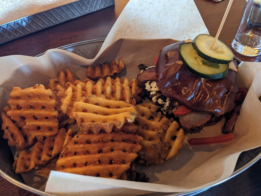 For an entree we got the pickled goat burger. It sounded unique and was. We loved it. I haven't had a burger like it before. It was a great blend of a pickled flavor and crumbly goat cheese on a burger. The waffle fries that came with it were spot on.