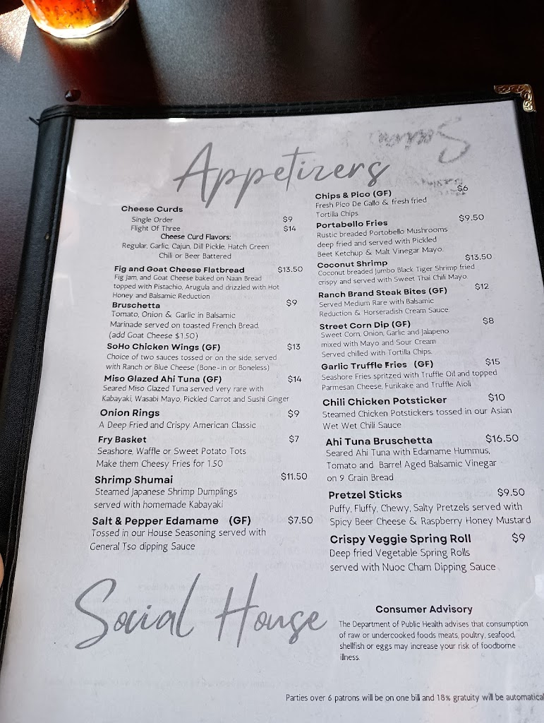 Went with my wife and my In-laws for dinner. Got wonderful service from our server Natalia. My wife had the Chispy Chicken Sandwich, my father-in-law had the Shrimp Po’Boy and they both raved about them. My mother-in-law and I had specials her the Seafood Pasta which had a good amount of seafood in it including whole shrimp, whole scallops and big chunks of lobster. I had the Steak & Frites which was one of the most tender ribeyes I’ve had in a restaurant in awhile cooked to a perfect mid rare with a delicious char on the outside combined with a Demi glaze and a delicious cowboy butter. Never a disappointing meal at The Social House.