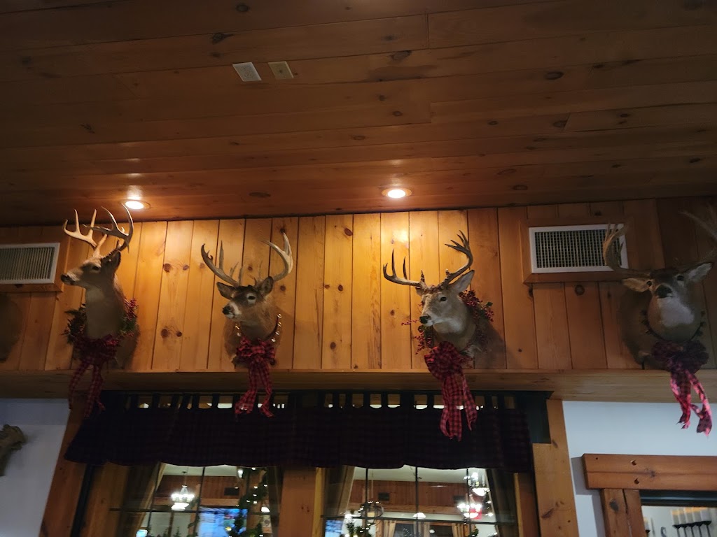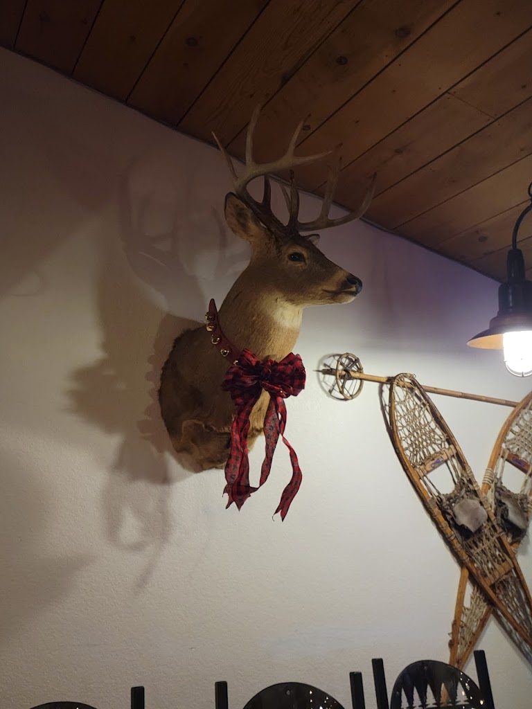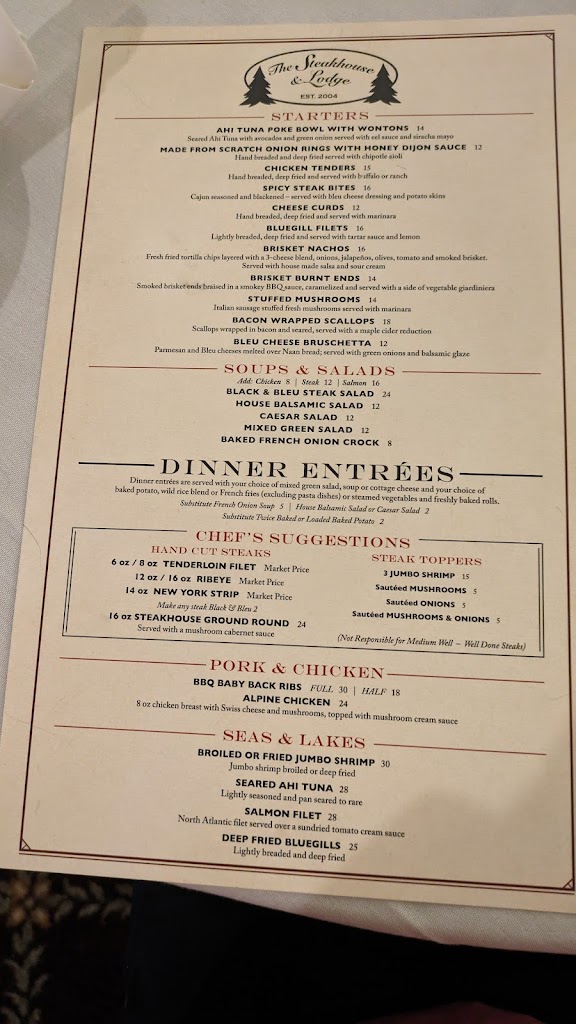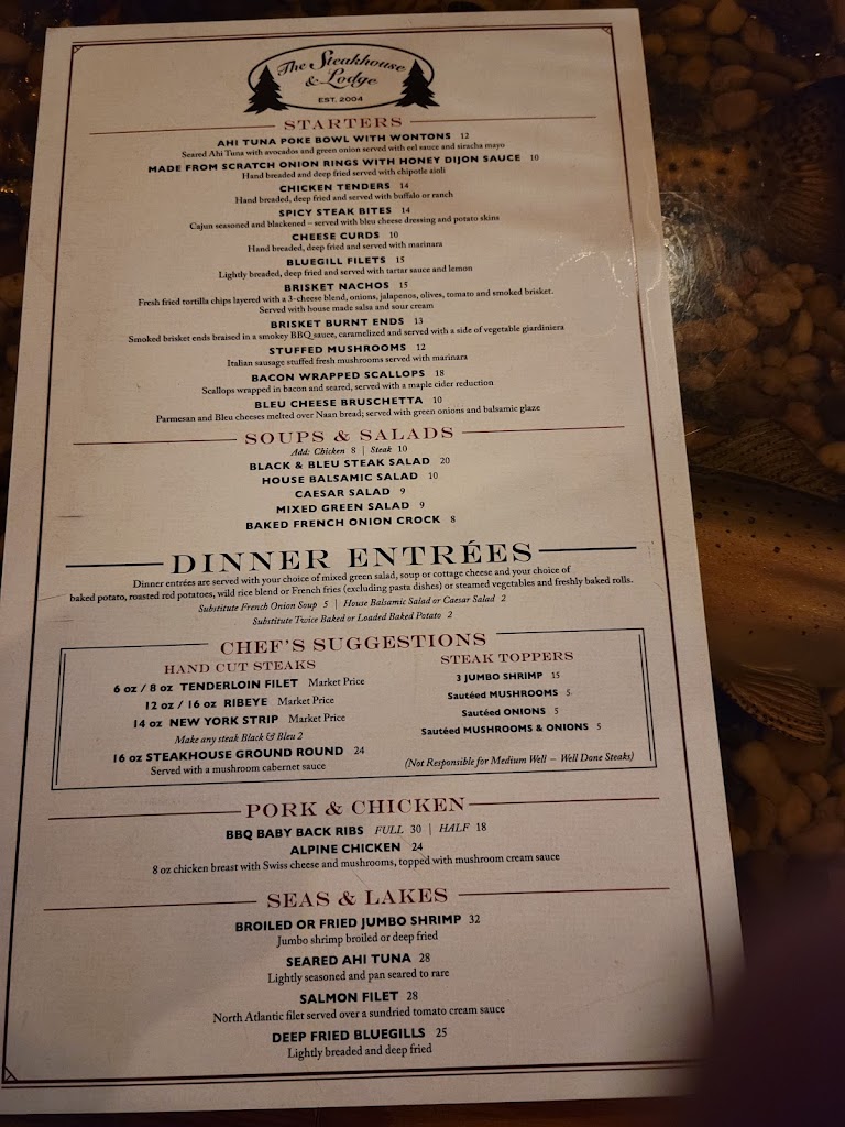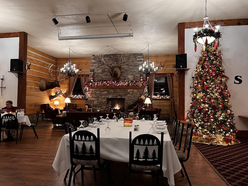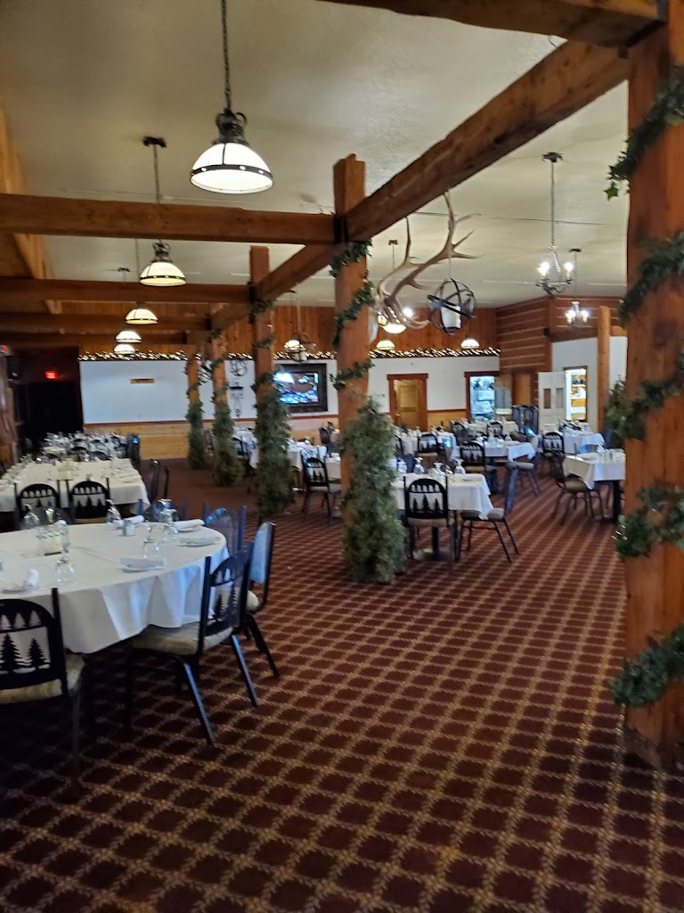 Spacious lodge and dining with a rustic charm. Was not overly impressed with the meal or service. Was difficult to get server’s attention and multiple items were forgotten for the table and the meal. Came with very wilted and pathetically prepared side salad. The prime rib was mediocre at best. Minimal flavor, was not a “melt in your mouth” cut by any means, and took a little effort to cut with a knife. No sides served with it…just the meat and potato (no idea what the orange slice was all about). The New York Strip was decent enough. No au jus, horseradish, steak sauce, butter etc and at no point was asked or offered any. This place has potential with some more experienced employees and trained staffing on fine dining etiquette, it could be excellent (this includes the need for more experienced chef). There are better places in the area for a good steak and prime rib if you’re looking this isn’t the one.