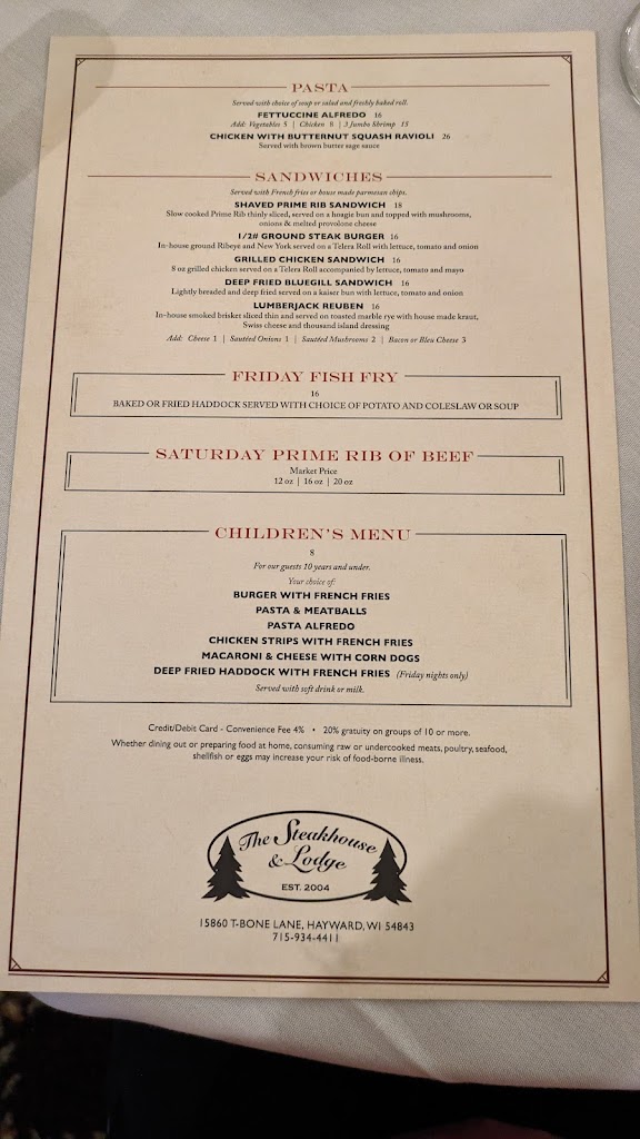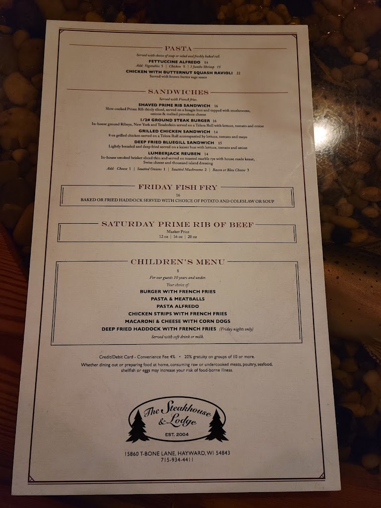The steakhouse and Lodge is an excellent place to go in Hayward Wisconsin. The food in the main dining room is great. The bar has a good happy hour with excellent bar bites. I always try to stop there when I’m there.