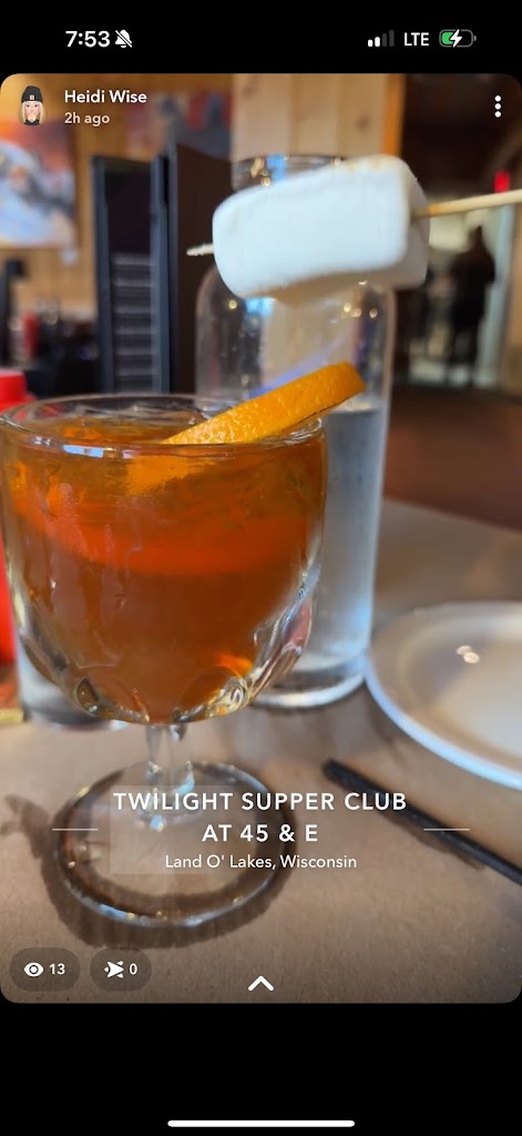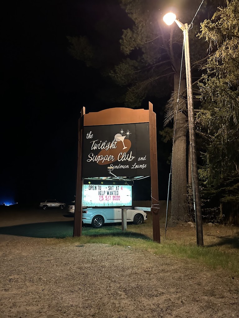 Highly recommend coming here. Twilight is your classic north woods supper club and I wouldn’t change a thing about it. Very friendly staff and shoutout to the bartender that premuddles his Old Fashions so he can keep serving other patrons, that is a pro Wisconsin move if I’ve ever seen one hahaha