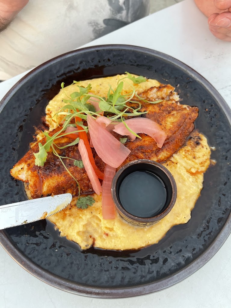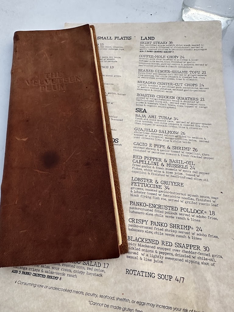 We went to the Velveteen Plum last night for dinner. The service we had was great. However, the food was very underwhelming. All of the food was very under seasoned and all of the fish was missing lemon/lime to compliment it. We got the fish cakes appetizer, which was a bit dry and there was not enough of either sauce to make up for it. We got the blacked red snapper and skirt steak for entrees. The snapper was cooked fairly well, but the cheddar grits were congealed and texturally seemed to be couscous rather than grits. The skirt steak was awful. We asked for it to be medium rare and it was well done without any sear. Additionally, it was cut with the grain! It also looked like it was cut with a dull knife. We asked for it to be taken back and removed from our check, and our waitress was so great working with us. Finally, we sat outside and were underwhelmed with the seating out there. We had to put silverware on a bare, scratched white table and the chairs and tables were cheap painted aluminum. This and the waiter’s attire (all of them) seemed incongruent with the menu, attire of guests, and overall vibe that this restaurant seems to advertise. Overall, we were disappointed in our experience and we will not be returning. Save your money and go to another restaurant until this place gets it together.