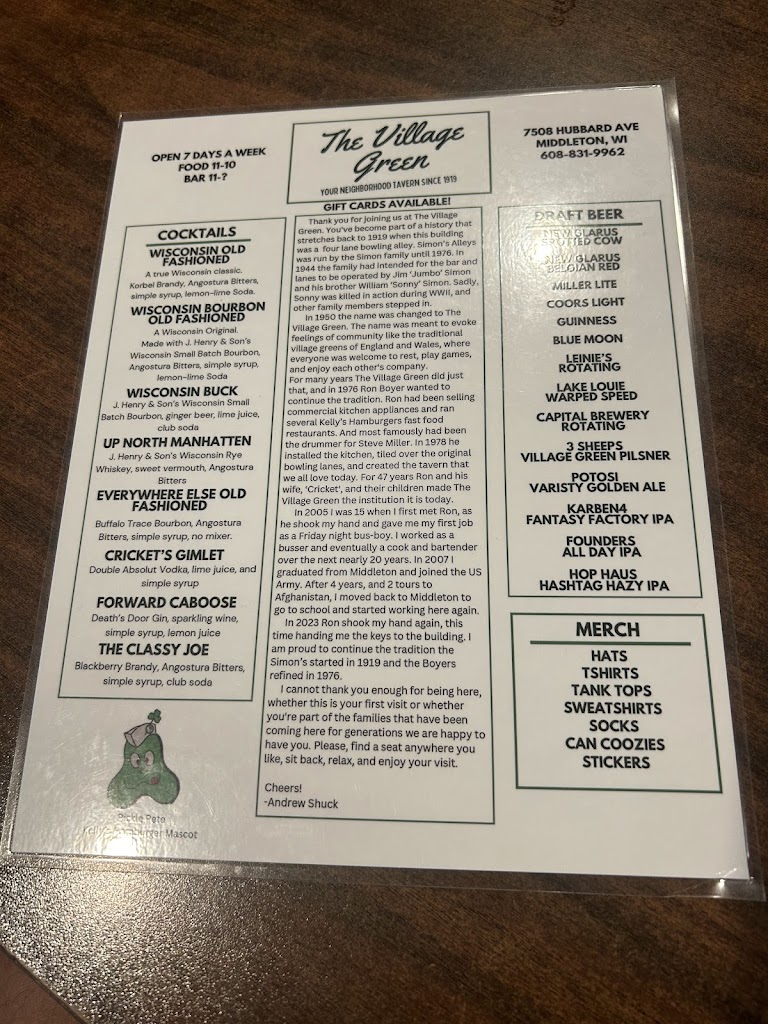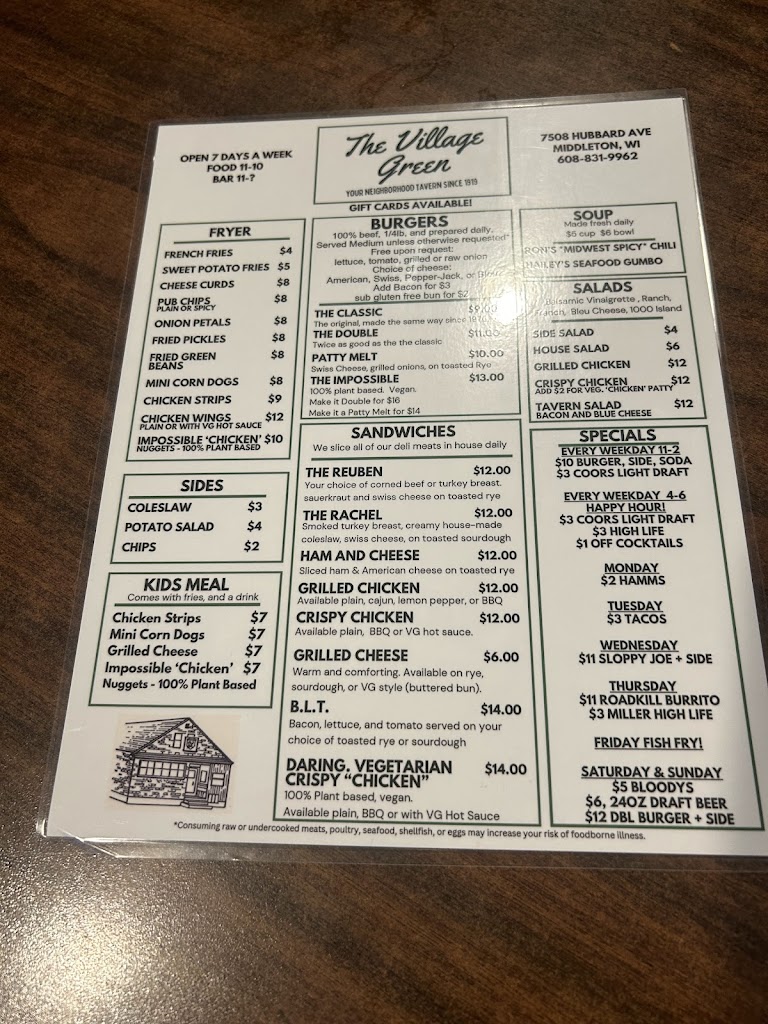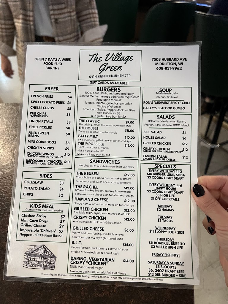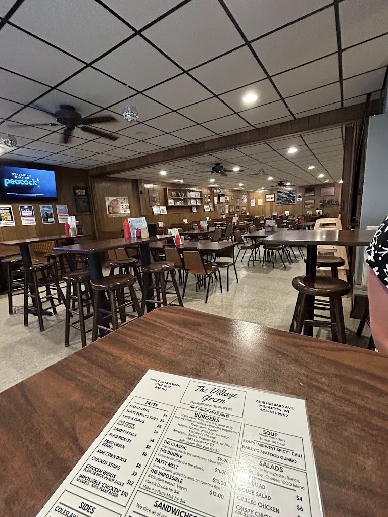 Village Green has been one of my favorite places to go to for many many years! Great food, great staff, good prices, especially these days, very casual, downtown Middleton… They don’t stay open real late though… I think maybe until 10 o’clock you can get things delivered or you can eat there or you can get it to take out… They are known for their cheeseburgers of course and I love the speedsters everything they have is good you can’t go wrong! And the owners actually show up and run the place if you know what I mean and it matters it makes a difference