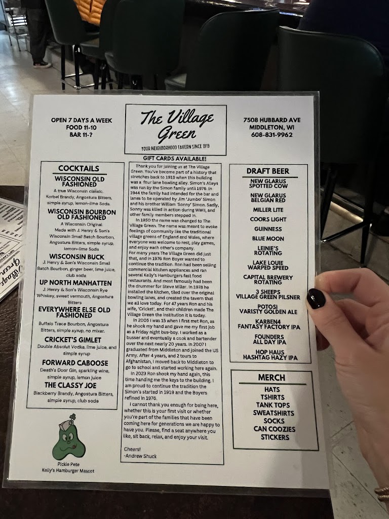 I've been going to Village Green since the early 80s. The staff, the food, the atmosphere - it's truly a gem. I consider it to be part of Middleton's history, and I love that this wacky green building is still standing proud. It's the most authentic business in the whole area, and it certainly has the most character. The burgers are legendary, and I really like their soup and sides. Try the nachos - they are not your "normal" nachos. The staff is extremely friendly, and they welcome you with open arms. If you're looking for a "dive" that is off the beaten path, this place is perfect for you. You'll even get a taste of Middleton's history with all of the old photos on the walls. For me, it's nostalgic and beautiful and I love it.