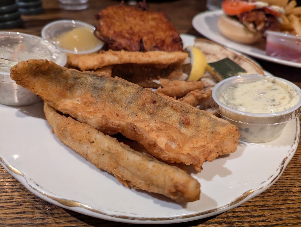 Relaxing atmosphere, good wine, delicious appetizers, excellent fish fry.