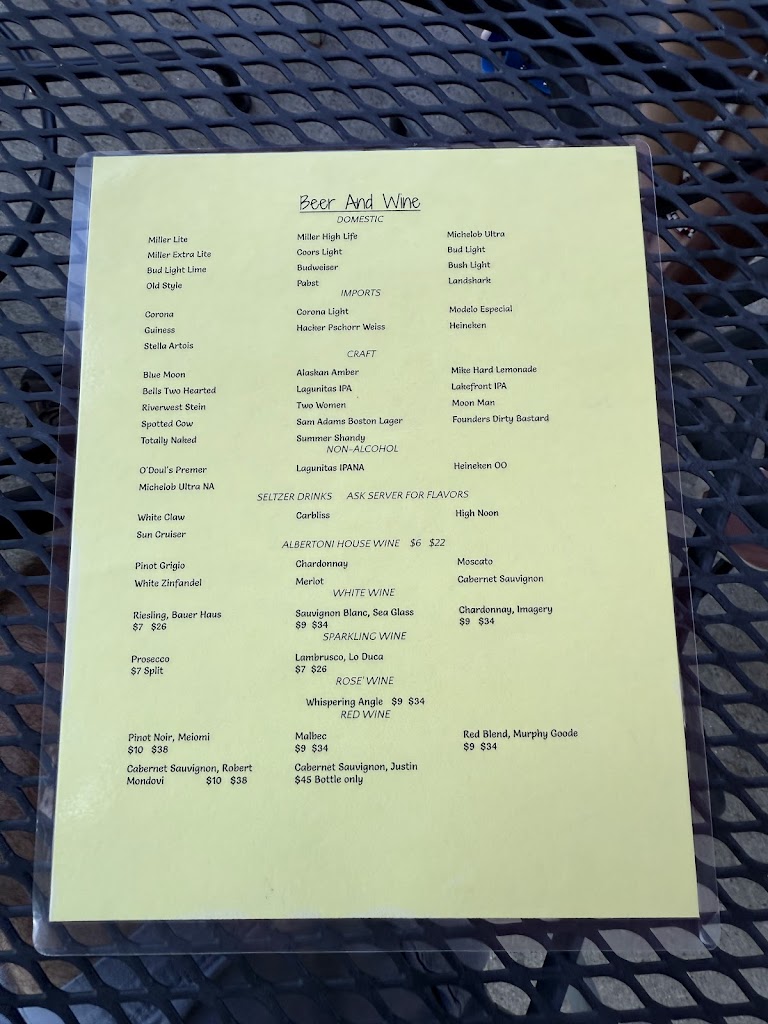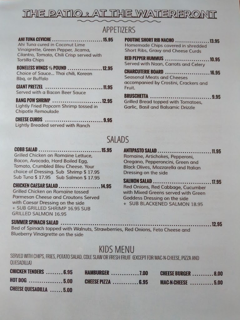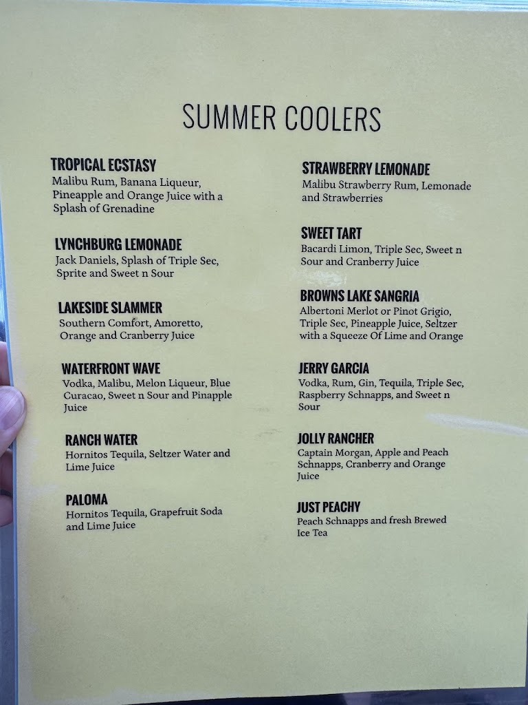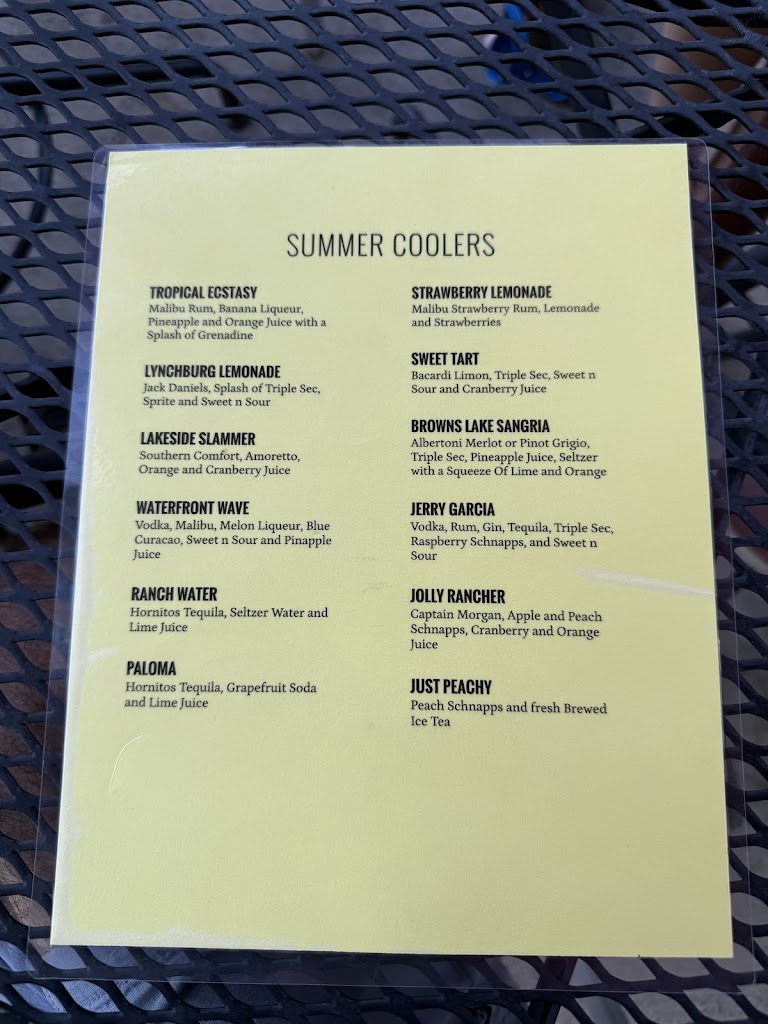 It’s ironic that the website has a picture of the patio, because it is never open, because they never have enough staff. We showed up for dinner, quoted over an hour wait, because they had no staff. Don’t bother going here, you will wait forever, food isn’t worth the wait.I live on Browns Lake, and we never eat here because every time we try to it ends horribly. Go to Bass Bay instead, much better food, cocktails and atmosphere.