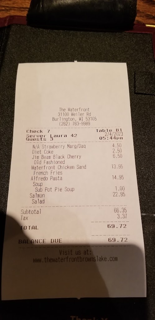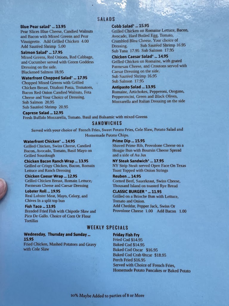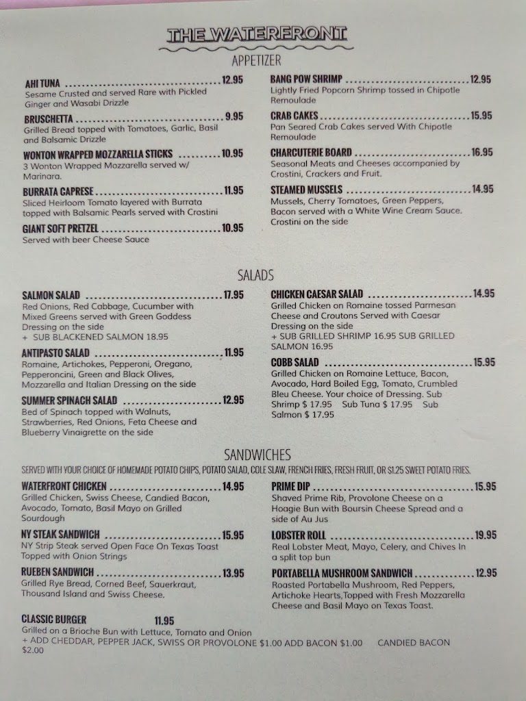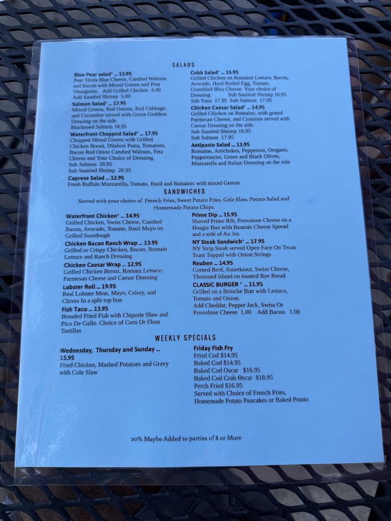 Had a server-in-training that was delightful. Service is excellent. Food is great. We went there to eat outside, but the storm was coming. I highly recommend Waterfront!