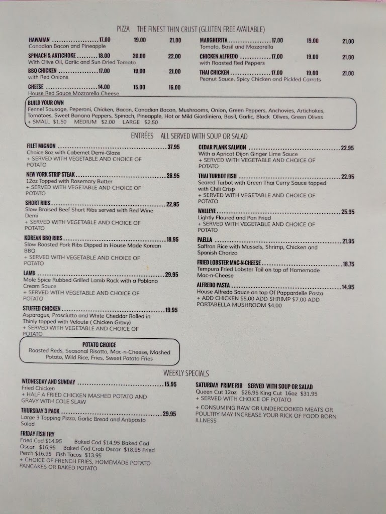 Our server Alle couldn’t have been more friendly and accommodating. We had a party of 9 and she did a fantastic job! Our choice that evening was the Thursday 3 pack which included a large pizza with 3 toppings, garlic bread and a huge antipasto salad. It was delicious. We dined on the outside patio which was very nice. Our mixed drinks were never empty thanks to Alle’s attentiveness. Others in our group were very happy with their entrees. Only negative that we saw was the pier, we came by car but if you come by boat the pier needs to be replaced. We will definitely be back!