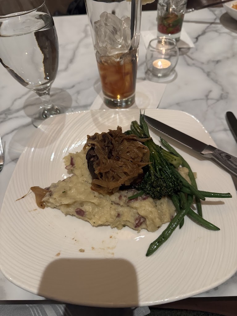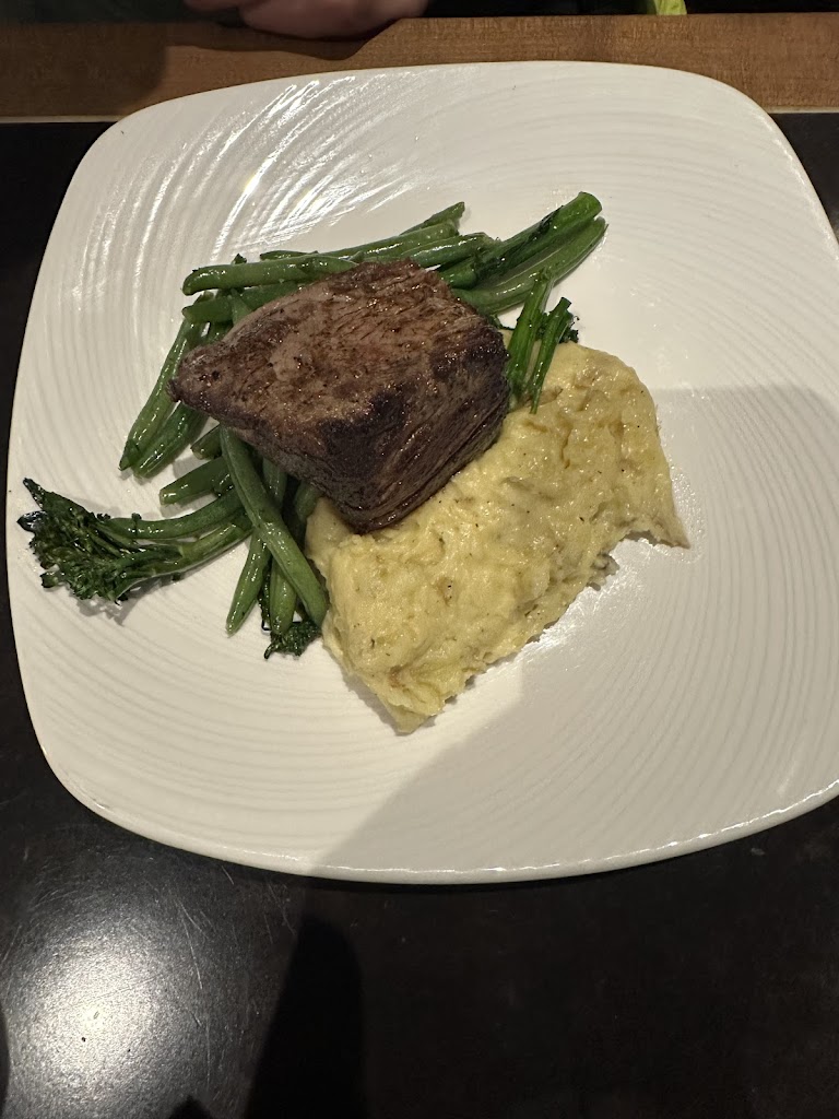 The filet was ordered medium rare, it was raw inside. The broccoli and green beans were salted so much we couldn't eat it. The mushrooms were dry and salty. The mashed potatoes were the best part of the meal. I will never go there again.