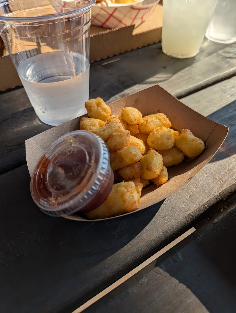 Great atmosphere!!! Looks like it'd be super fun in the summer, while outside. We were there for the cheese curd crawl and spent almost 2 HOURS waiting for our food...took about 20 minutes just for our drinks. And not one other table had food, so we were SO confused!! The waitress even forgot to put in part of the order. Super nice lady, but that alone - we will not be back! Much better service elsewhere. We had 6 restaurants to go to for the crawl and decided to eat at the slowest one, of course!! Wasted so much time here. Plus the food was greasy and gross 😝 do NOT recommend eating here.