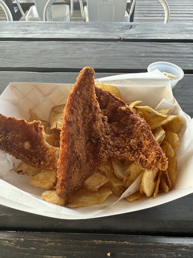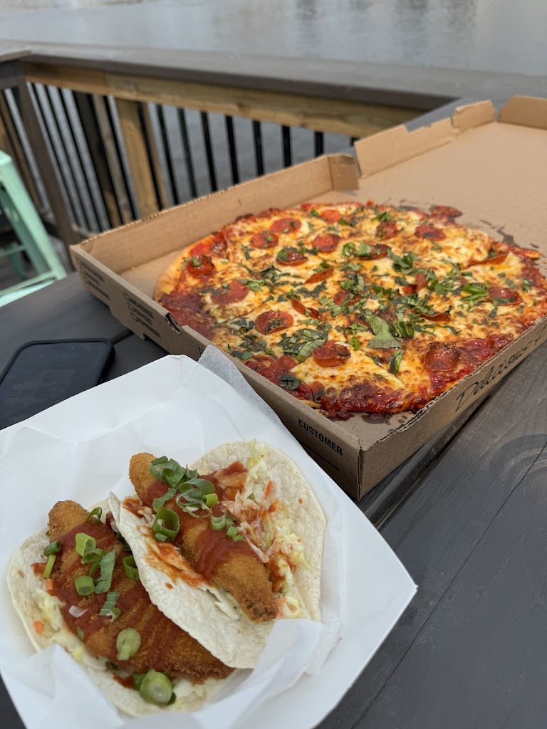 The Wharf came highly recommended and for good reason. The food was delicious and the view absolutely stunning. You go to the kitchen window to order food and the bar to order drinks. We had the perch tacos and the Bee-sting pizza. Both were the perfect balance of savory and a little kick. They have live music most of the time with a large outdoor seating area. Definitely recommend!