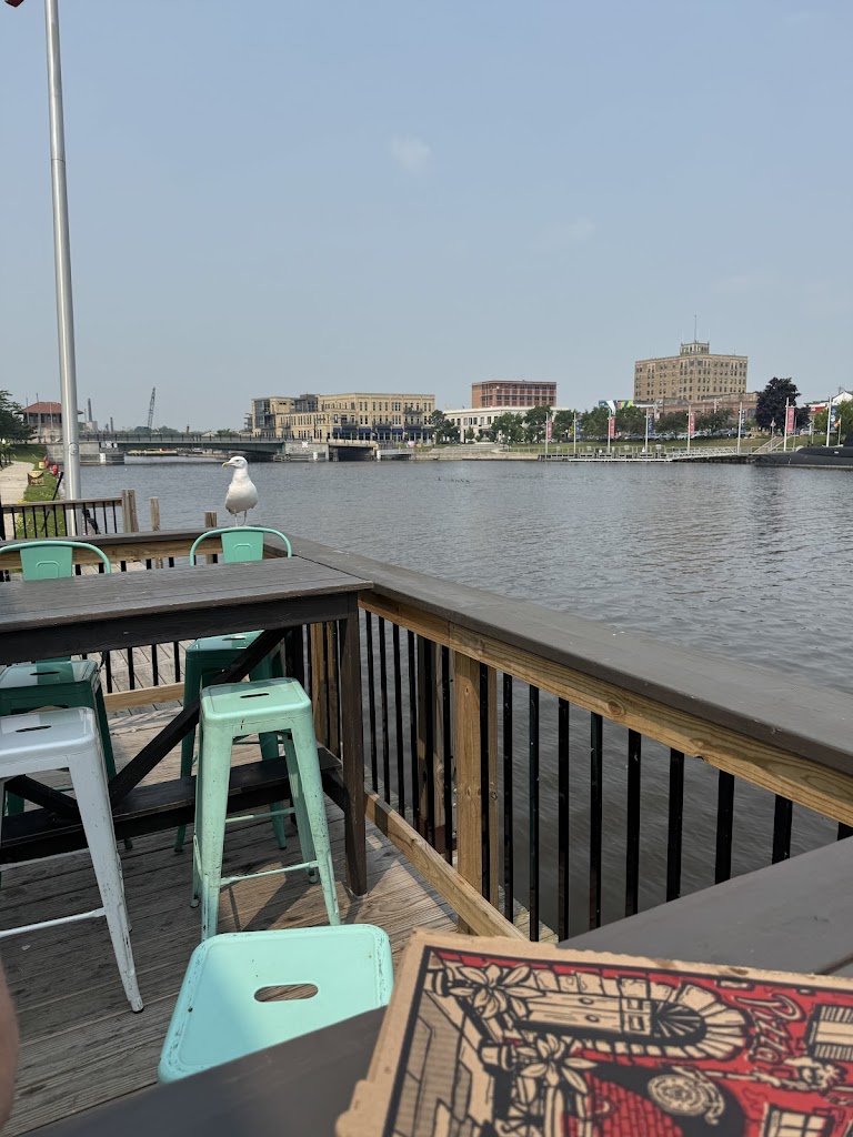 What a fun place. On Saturday we had a farmers market next door as well. Great burgers and fries. Unique drink menu. Beautiful waterfront dining. Submarine across the river, SS Badger sailing from nearby such a unique spot.