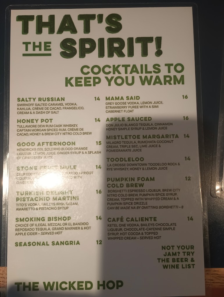Food was delightfully mediocre but reasonably priced. The cheese curds were not up to Wisconsin standards and were overcooked. My kids had zero problem finishing them off though. The local beers served here were ok, but the establishment lacks variety. I feel like I was the waiter for our table as I did most of the waiting. Our server had a serious issue keeping my glass full as it was empty most of the night. She would disappear from 20-30 minutes at a time. As Brian Griffon from family guy aptly put it, “I have left more personality in tightly coiled piles on the lawn.” This describes our server to a T. Whenever she did decide to grace us with her presence she never smiled and possessed zero bedside manner. Next time we are in town we will skip the Wicked Hop and try to discover something more refreshing.