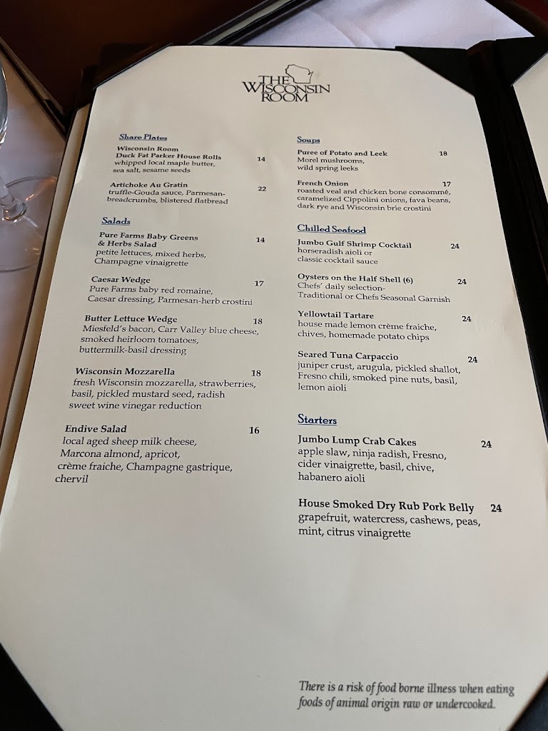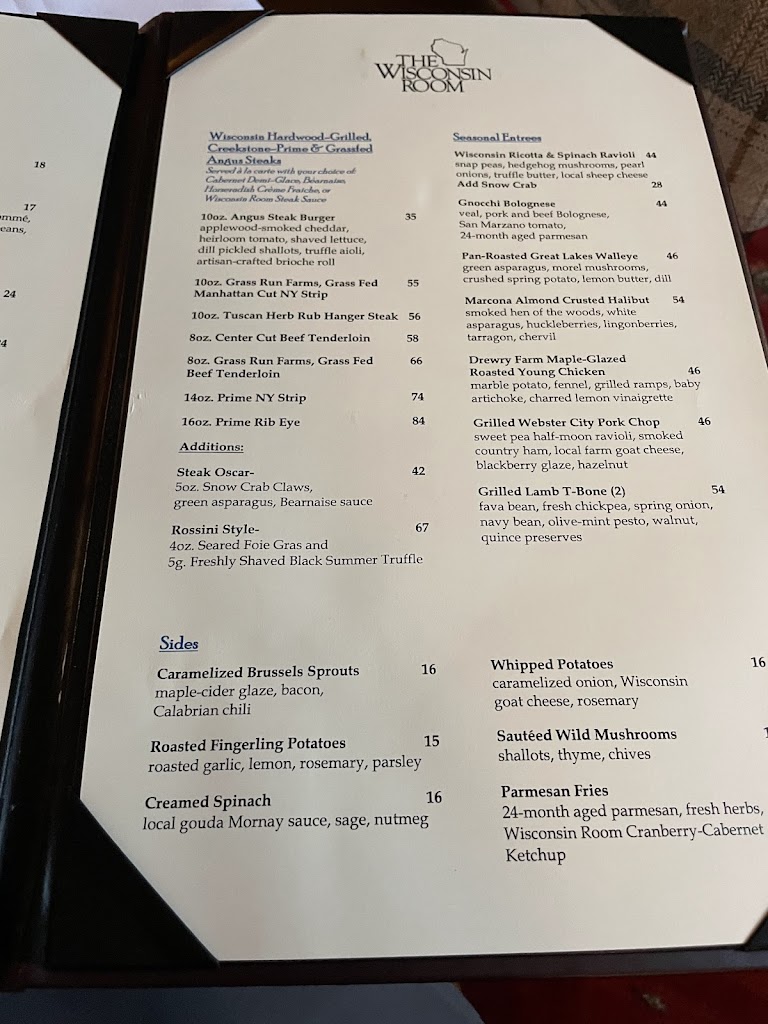 Wonderful food, wonderful staff. It was a terrific way to spend a special Christmas Eve with my husband. I cannot imagine a time I would turn down an opportunity to go to The Wisconsin Room.