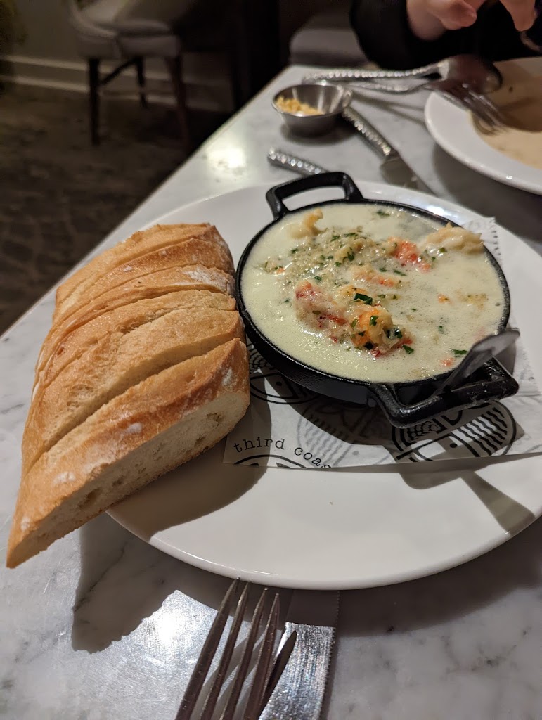 First of all, let me say that the service and staff here were amazing and completely what we would expect from Third Coast and its previous reviews. The ambiance was delightful and according to our hostess, we had one of the best views in the restaurant, overlooking the entire space from atop the upper floor area. We are self described foodies and really look forward to restaurants that specialize in fish and seafood, as it can be expensive given the market these days. I have to be honest, there were a few let downs in my opinion as well as a couple of shining dishes. The bright spots... the Foie Gras was amazing! Brilliantly paired with the sourdough and the sauce didn't overpower the dish but let the Foie Gras come through... just excellent! We both really enjoyed the clam chowder, as well, however we ordered the bowl and they were kind enough to split it into two cups for us to share. Yet my cup was left wanting for any chunks of potato or bits of clam and I found myself asking for a spoonful of my spouse's cup as hers was laden with those delicious chunks of goodness... wishing maybe they stirred the pot before serving up my cup? The squash side dish was also a brilliant dish. I found the dish to be sweet and the perfect bite of crunch and mashy texture you'd expect from squash. It reminded me of holiday meals and candied yams! Now, for the not so good... we ordered the fried oyster sliders. These were not good. The bun overwhelmed the oyster, which disappeared in a sea of sauces and bread. You couldn't even taste the oyster at all. All I got was sauce, spicy but not a bad flavor and the dinner roll. My first bite also contained a decent sized portion of shell, which, in my opinion is a huge no-no when it comes to oysters, especially when its breaded and hard to see. That was disappointing. In addition, our entrees were underwhelming. We ordered the Black Cod, which came with entirely to much sauce... the Cod was sitting atop a bowl of this soupy sauce that should have been eaten with a spoon and not a fork. It was a green curry sauce but did not have the right flavor to be called a curry in our opinion. The white fish was simply steamed perhaps and placed atop the pile without any further attention. We also had the lobster pot pie. It came in a huge metal bowl and at first glance, appeared with three huge chunks of lobster tail in the center of this flaky, puff pastry ring. It really was a clam chowder soup underneath that ring and the only lobster to be found was what was sitting in the center. It had triangular chunks of roasted potato, carrots and clams and again, should have been eaten with a spoon rather than a fork. The puff pastry was good until you got to the bottom and you could tell it wasn't cooked all the way through. My spouse ordered the key lime tart and enjoyed those flavors. I attempted to order two other desserts and found they were both unavailable, which might be understandable as we had an after 7 pm reservation, but I was still disappointed not to be able to try those tasty looking treats...