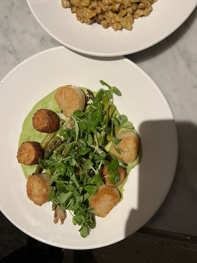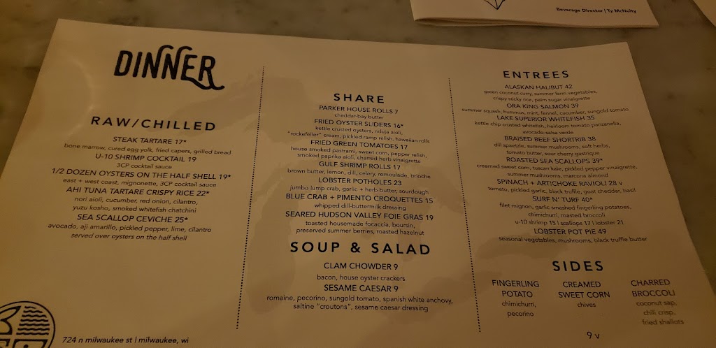 Service was decent. The drink menu was super strange, not enough classics, and not great execution on the ones they did offer. I ordered the whitefish, but I was brought the cod. They then made me an order of the whitefish. Cesar salad was strange and “deconstructed”. Oysters were good. Both scallops orders had to be sent back, way too salty. Side of roasted vegetables was salty. I would not recommend eating here, the food was not high quality enough to demand those prices in Milwaukee.